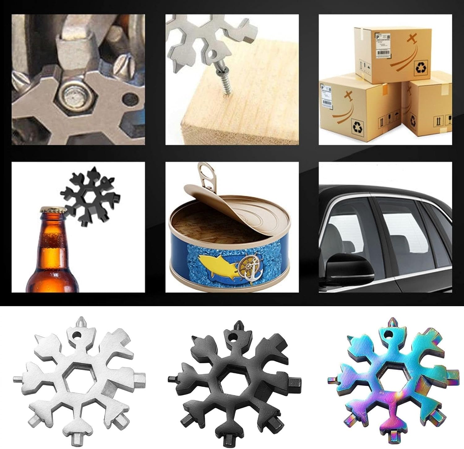 Claw , hammer , Serrated blade ,Knife, Bottle Opener ,Screwdriver, ect…