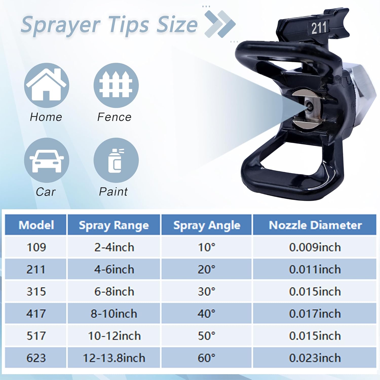 Spray uniform fine: different models (109,21,315,417,517,623) spray range will vary due to the size of the aperture, nozzle adopts reverse airless cleaning switch nozzle design, can be quickly cleaned in a reversible position, prevent nozzle blockage, not easy to plug, spray uniform, reduce material loss, save costs.