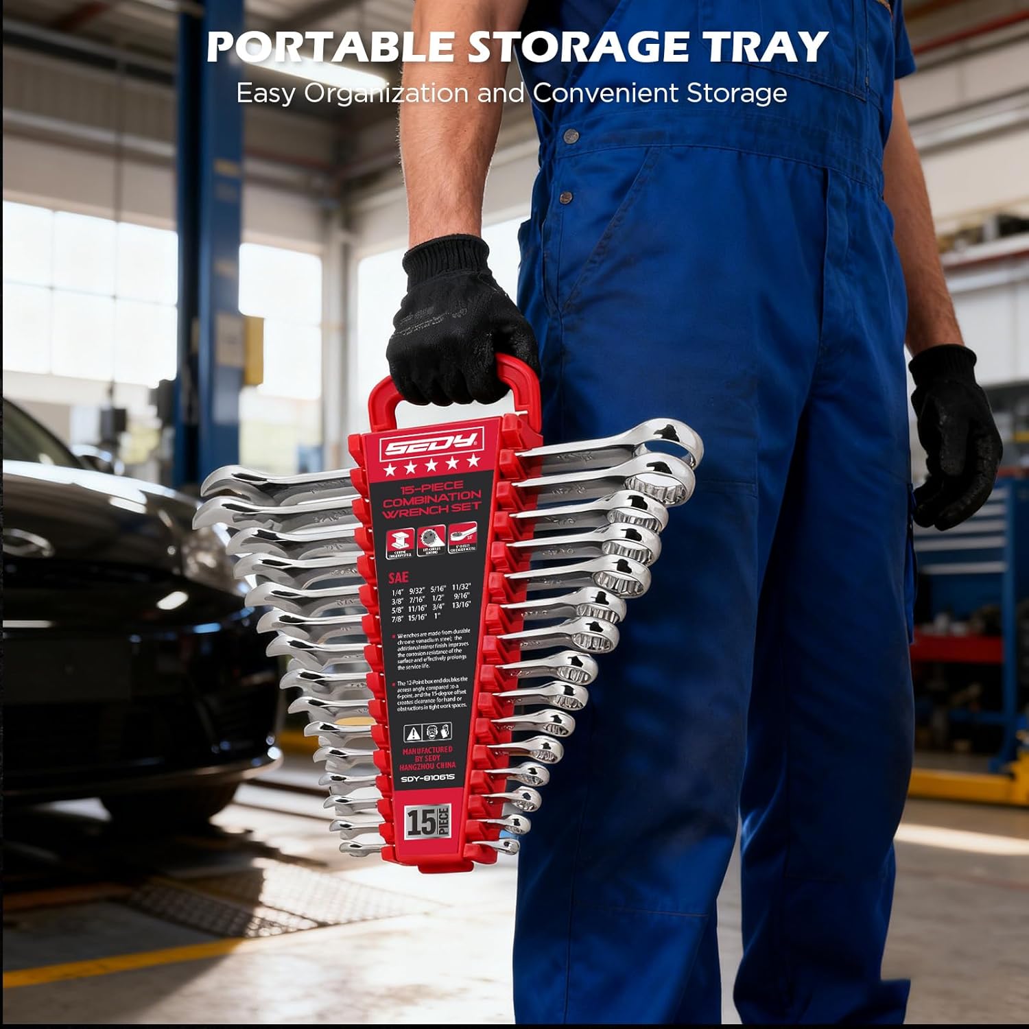 ORGANIZED STORAGE — Includes a heavy-duty organizer rack with a secure carry handle, keeping all 15 SAE combination wrenches neatly arranged, easy to access, and portable for mechanics and workshop professionals