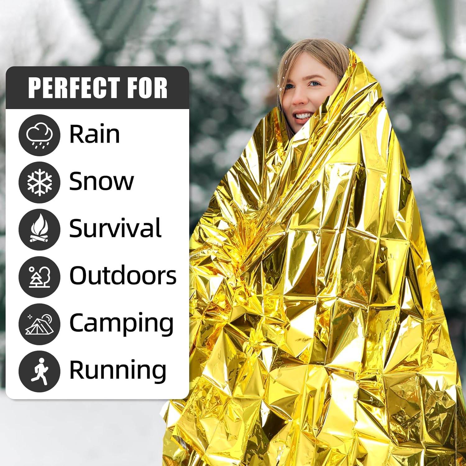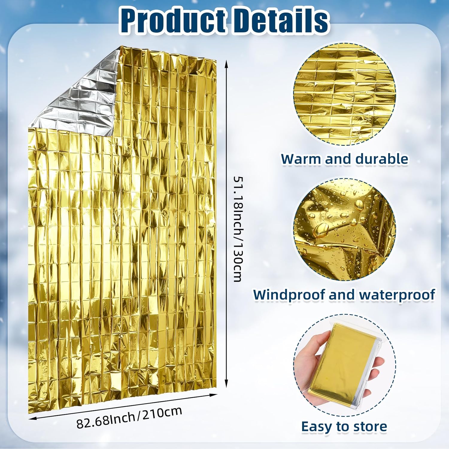Emergency Thermal Blankets: each gold thermal blanket measures 130x210cm and folds easily into a compact size; Suitable for emergency use, hiking, camping, car kits, or cold weather survival situations; Lightweight and portable
