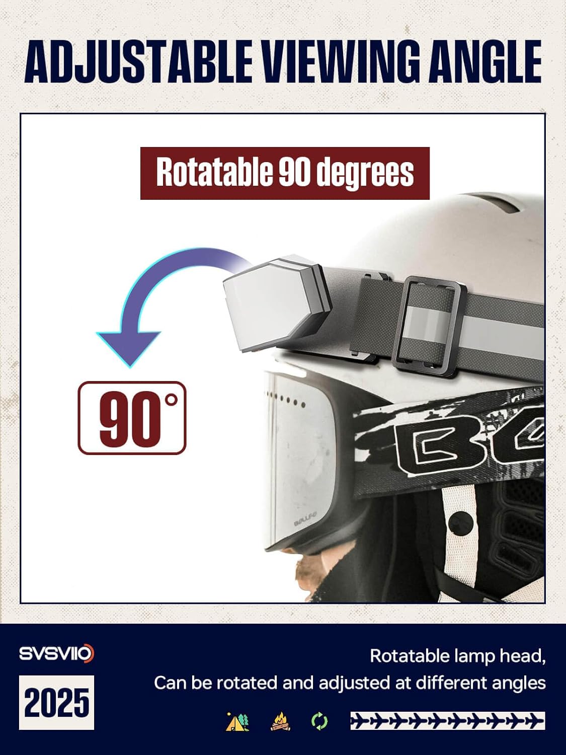 [90°Adjustable & Ergonomic Design]: 90°Rotatable Strip: The SVSVIIO headlamp features a unique 90°downward rotatable strip, allowing you to adjust the light angle as needed to expand your visible range. Ergonomic & Comfortable Fit: The adjustable elastic headband provides a secure, comfortable, breathable, and non-slip fit for long-lasting wear.
