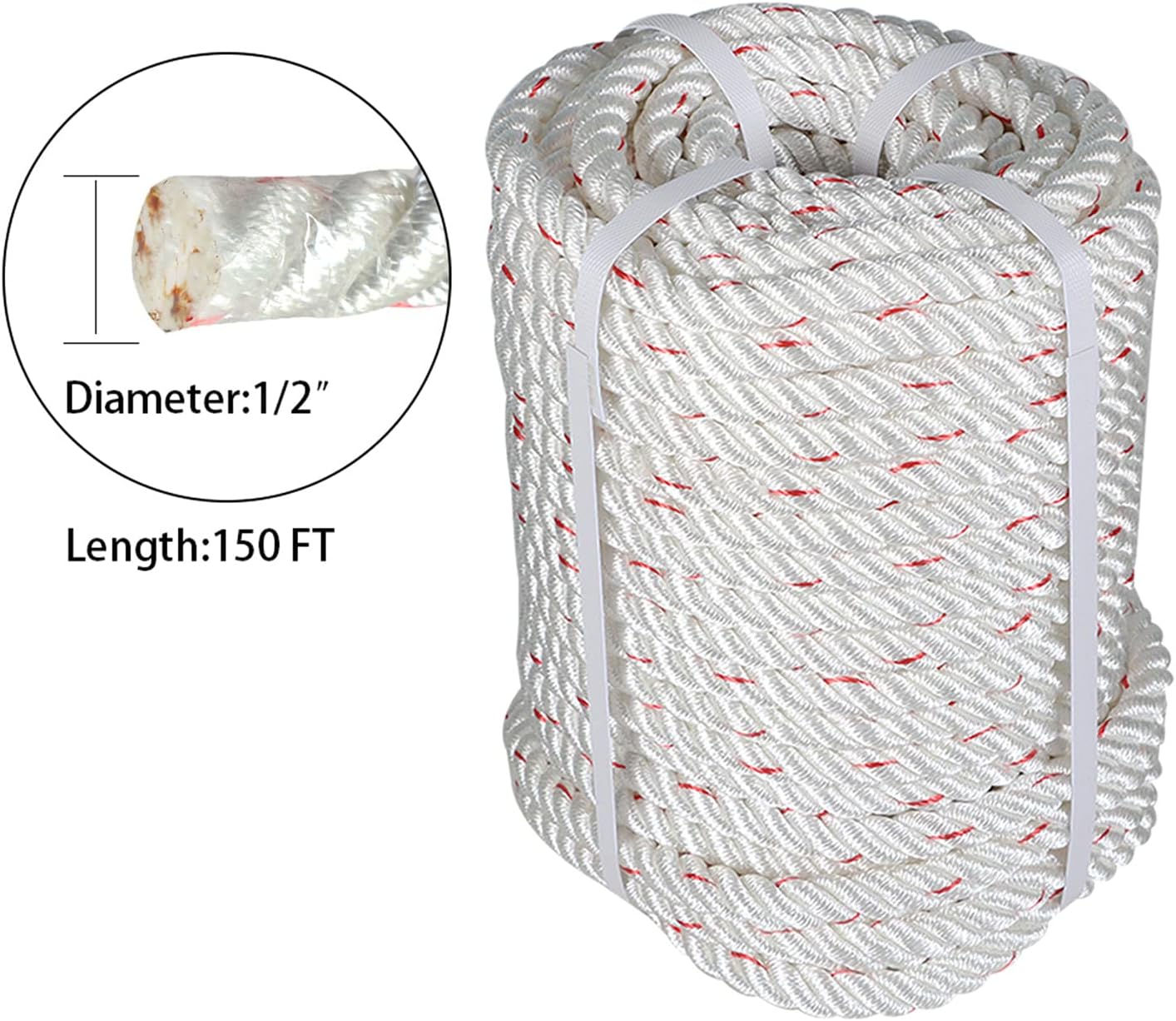 Material – Premium double braid polyester, diameter: 1/2 inch, length: 150 feet, about 4,000 lbs tensile strength
