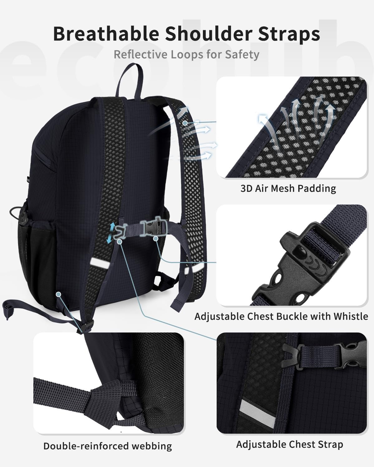 【Durable, Breathable & Safety-Focused Design】 Made from 210D ripstop nylon, water-resistant. Breathable mesh shoulder straps, adjustable chest strap with whistle, and multiple reflective webbing points for improved visibility during night walking or cycling.