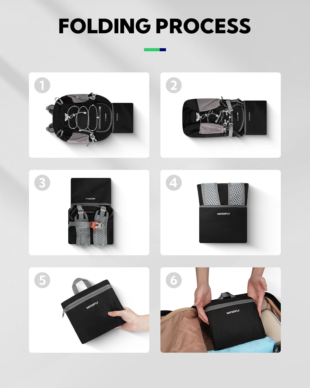 Lightweight And Foldable Design: This WATERFLY small lightweight foldable backpack weighs only 0.68 lb and offers a 15L capacity. Full dimensions: 16.54 x 11.02 x 4.72 in; folds down to a compact 7.87 x 6.3 x 2.16 in for easy storage in pockets, luggage, and handbags. It also fits most airline carry-on rules