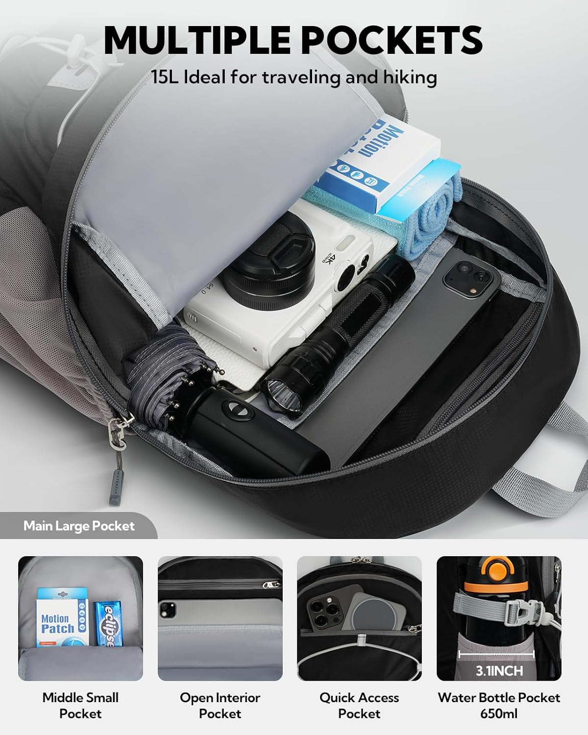 Multi-Pocket Smart Organization: 4 main compartments include a large double-zipper main pocket with inner slip pocket, a middle zipper pocket, a quick-access front pocket, and two side mesh pockets with secure buckle to prevent umbrellas and water bottles from falling. Elastic front strap holds extra clothing or gear. Keep things organized
