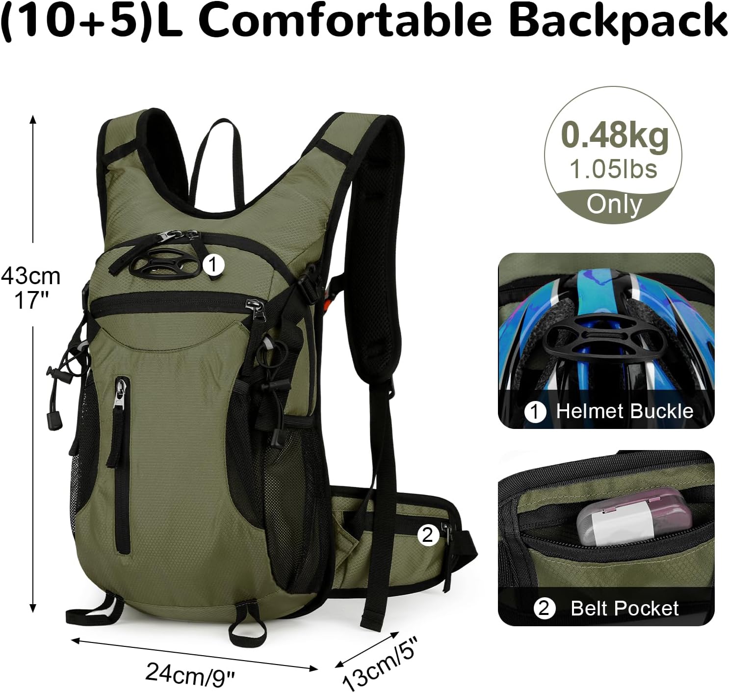 Small Cycling Backpack: This 15l backpack has a front buckle and an open compartment for fixing the helmet. Internal hydration reservoir sleeve with tube exit port offers you easy access to your water supply (reservoir not included).