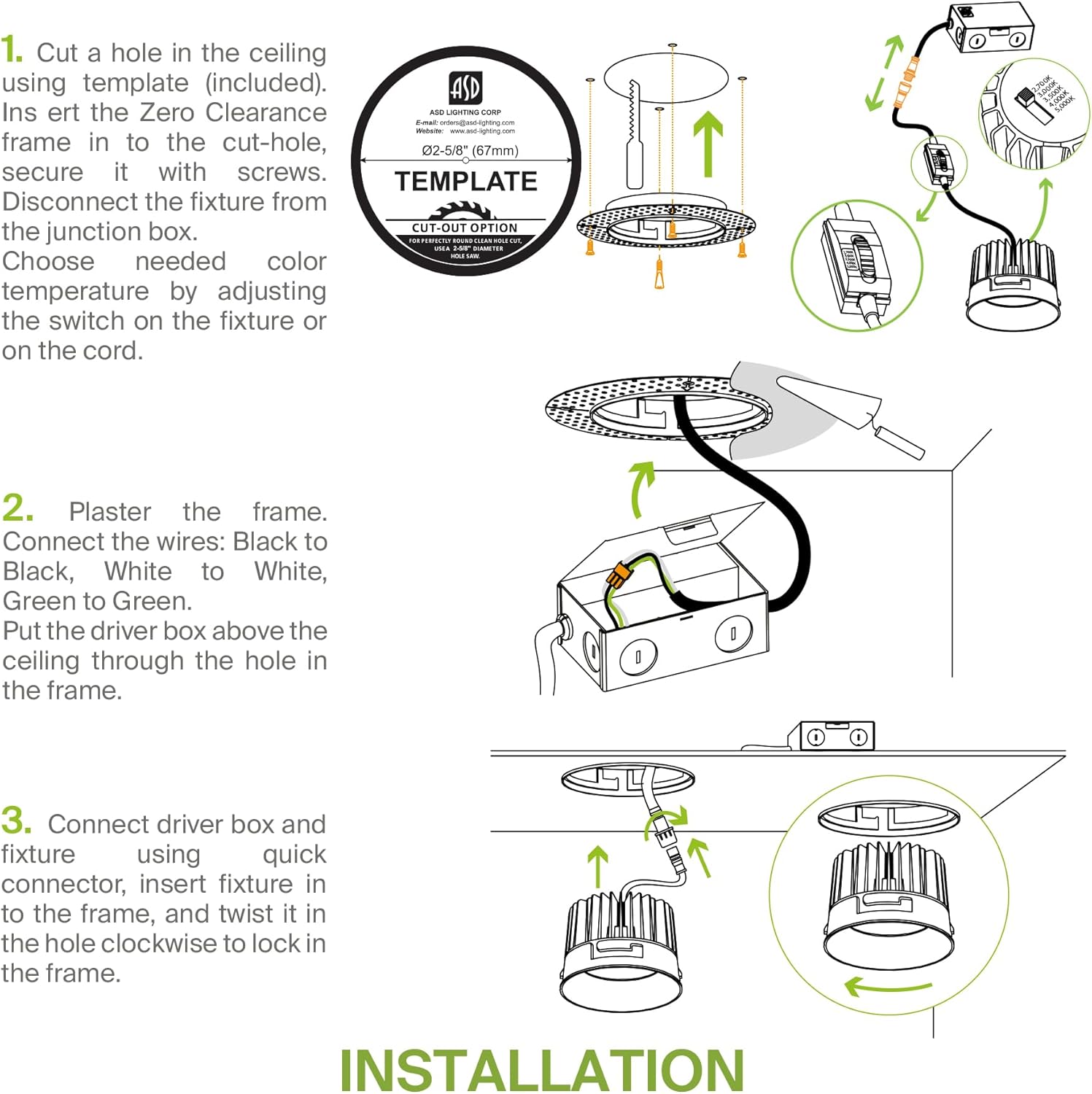✅ DESIGN – ASD LED trimless recessed lighting has a twist-lock design and includes a round mud frame to be plastered over, giving it a smooth trimless look. Our 2 inch recessed LED lights have a durable airtight aluminum housing, multifaceted specular reflector with a 38° beam angle, and anti-glare PC lens. These down lights for ceiling are designed to operate on 120V circuits with a TRIAC dimmable driver