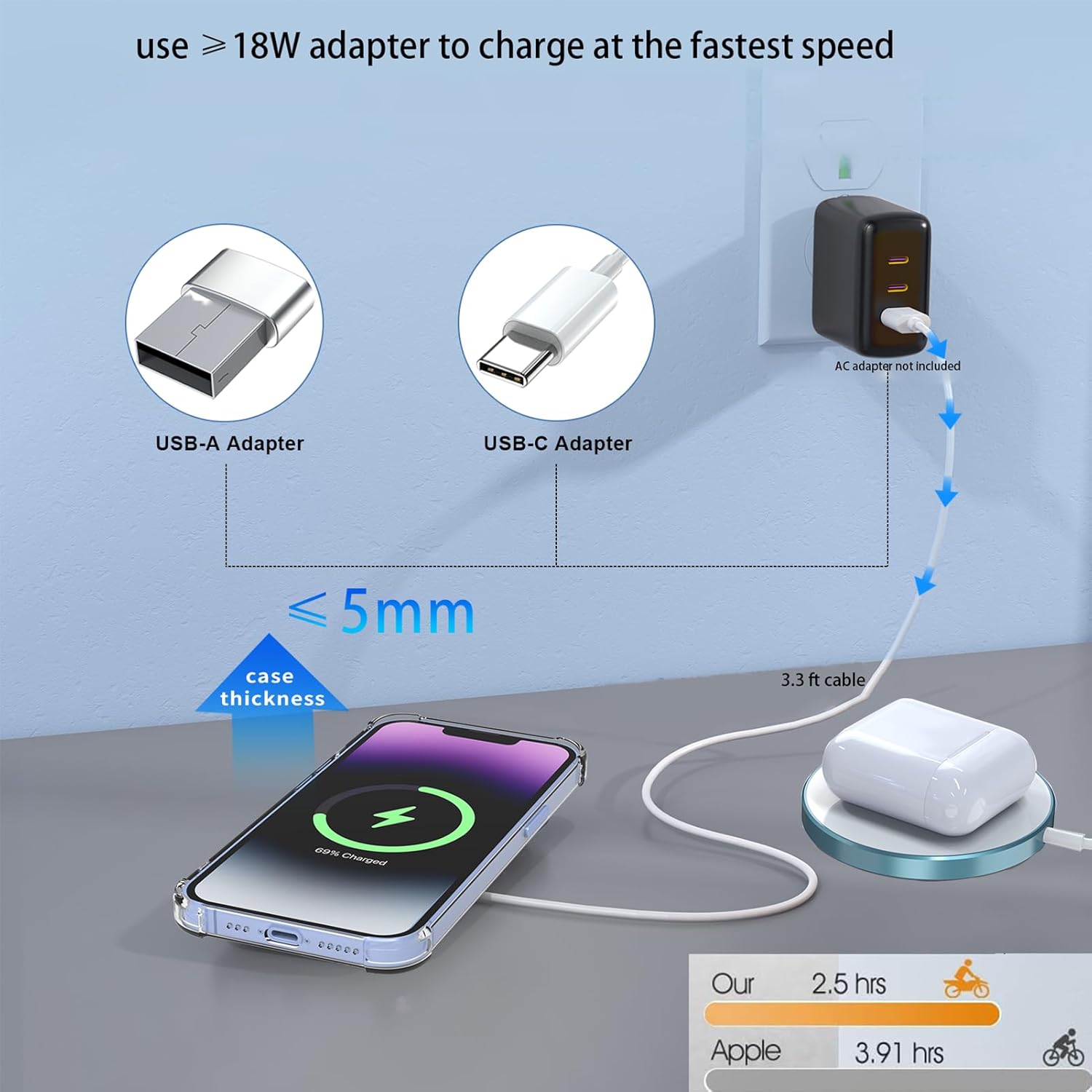【15W Wireless Charging Pad】This magnetic charger supports 15w max fast wireless charging for your phone. For optimal charging performance, please use an adapter with 18W or higher. Note: A normal case will weaken the magnetic force and will not stick to the charger, please use a magnetic case.