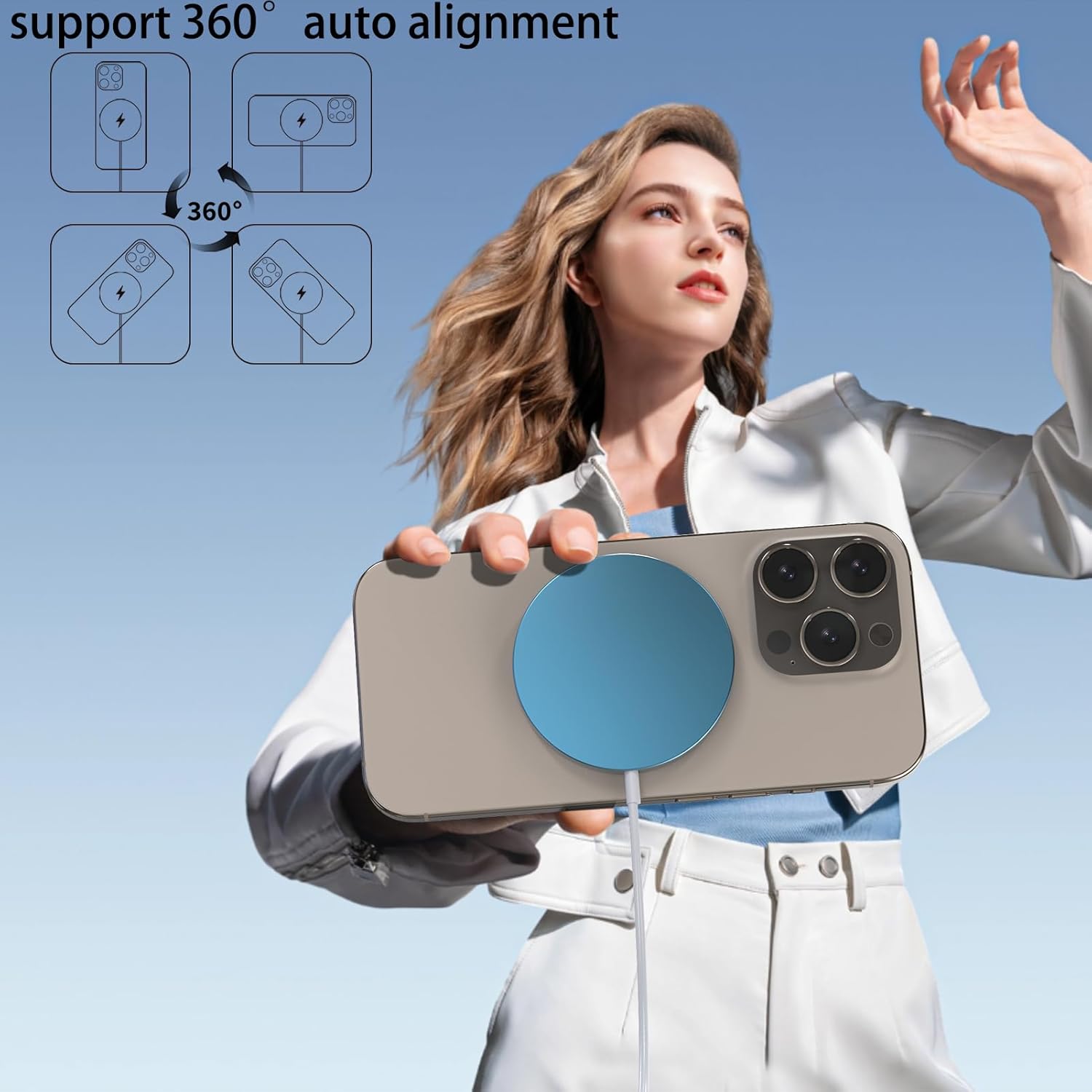 【for iPhone 17/16/15/14/13/12】This magnetic wireless charger is designed for iPhone 17/17 Air/17 Pro/17 Pro Max/16/16 Plus/16 Pro/16 Pro Max/15/15 Plus/15 Pro/15 Pro Max/14/14 Plus/14 Pro/14 Pro Max/13/13 mini/13 Pro/13 Pro Max/12/12 mini/12 Pro/12 Pro Max, and AirPods 2 3 Pro. iPhone 8/8 Plus/X/XS/XS Max/XR/11/11 Pro/11 Pro Max/16e equipped with a magnetic case also supports magnetic charging.