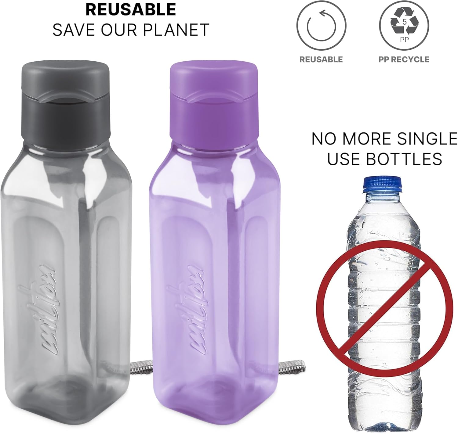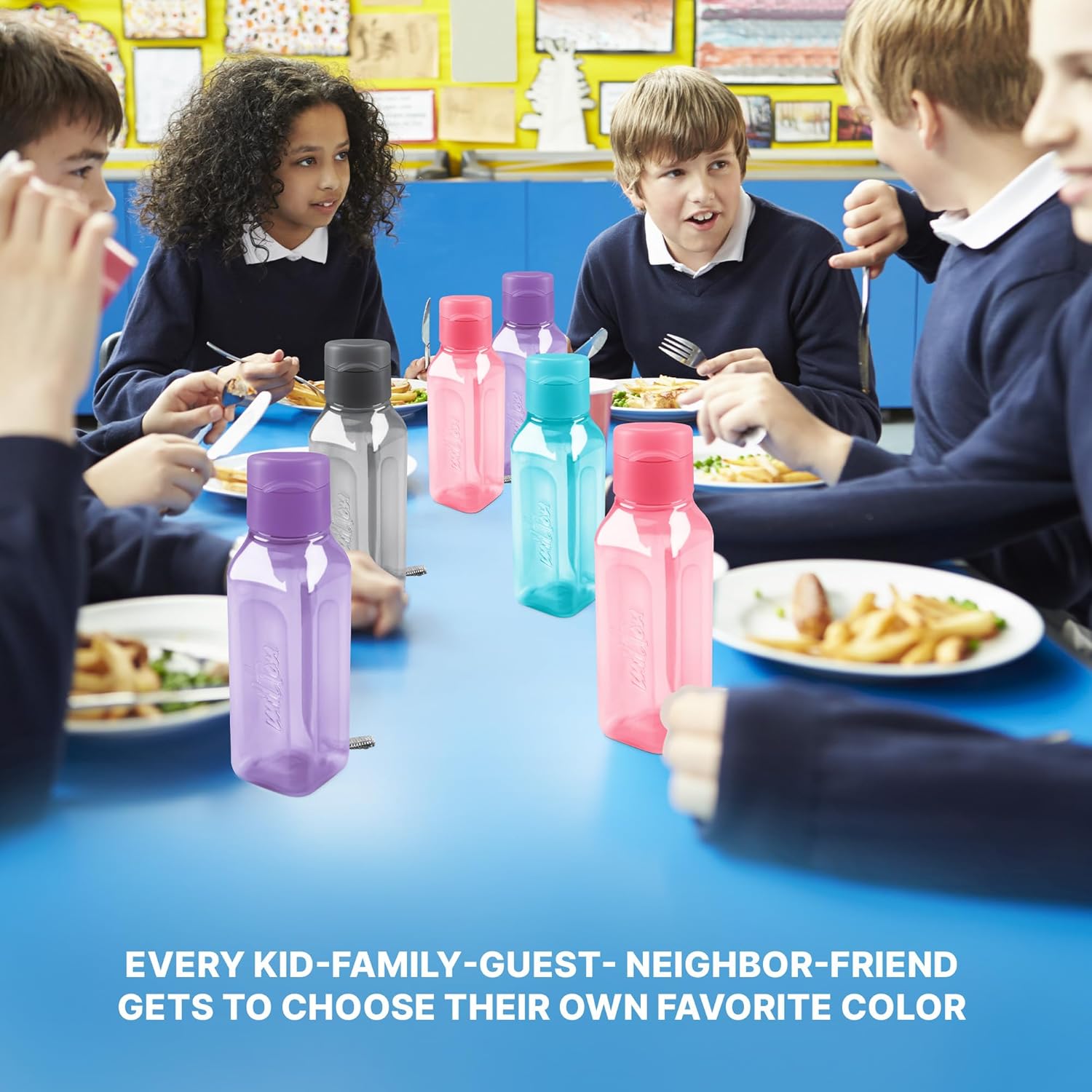Multipack for the Entire Family: These plastic juice bottles are available in multipack options, in assorted colors, which makes them perfect for both kids and adults. The square design allows easy organization and storage while the wide-mouth design makes refilling effortless.