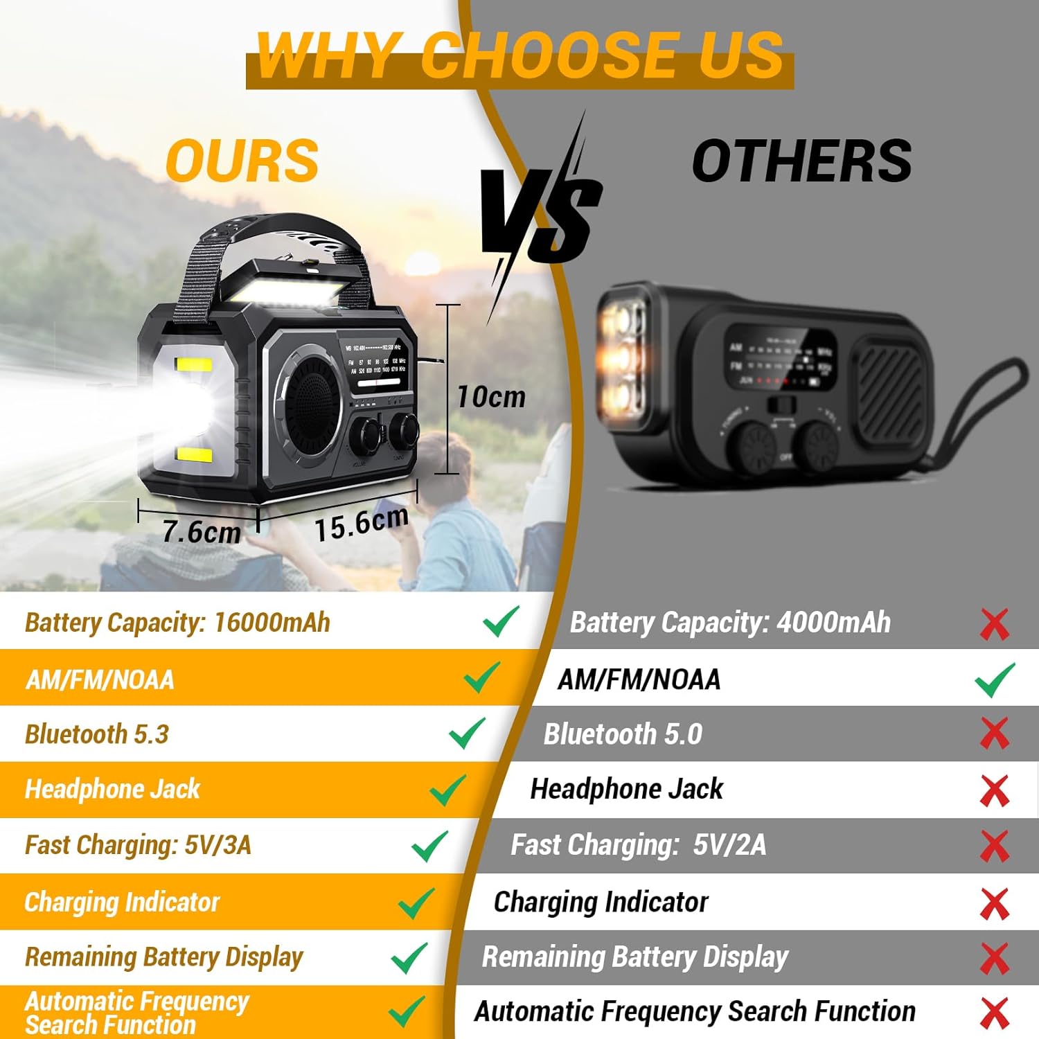 Massive 16000mAh Power Bank & Extended Runtime: Never be powerless in an emergency. The huge built-in 16000mAh battery powers the radio for up to 180 hours (medium volume), the reading lamp for 58 hours, or the bright LED flashlight for 30-58 hours. Crucially, it acts as a power bank to recharge your phone and other USB devices multiple times.