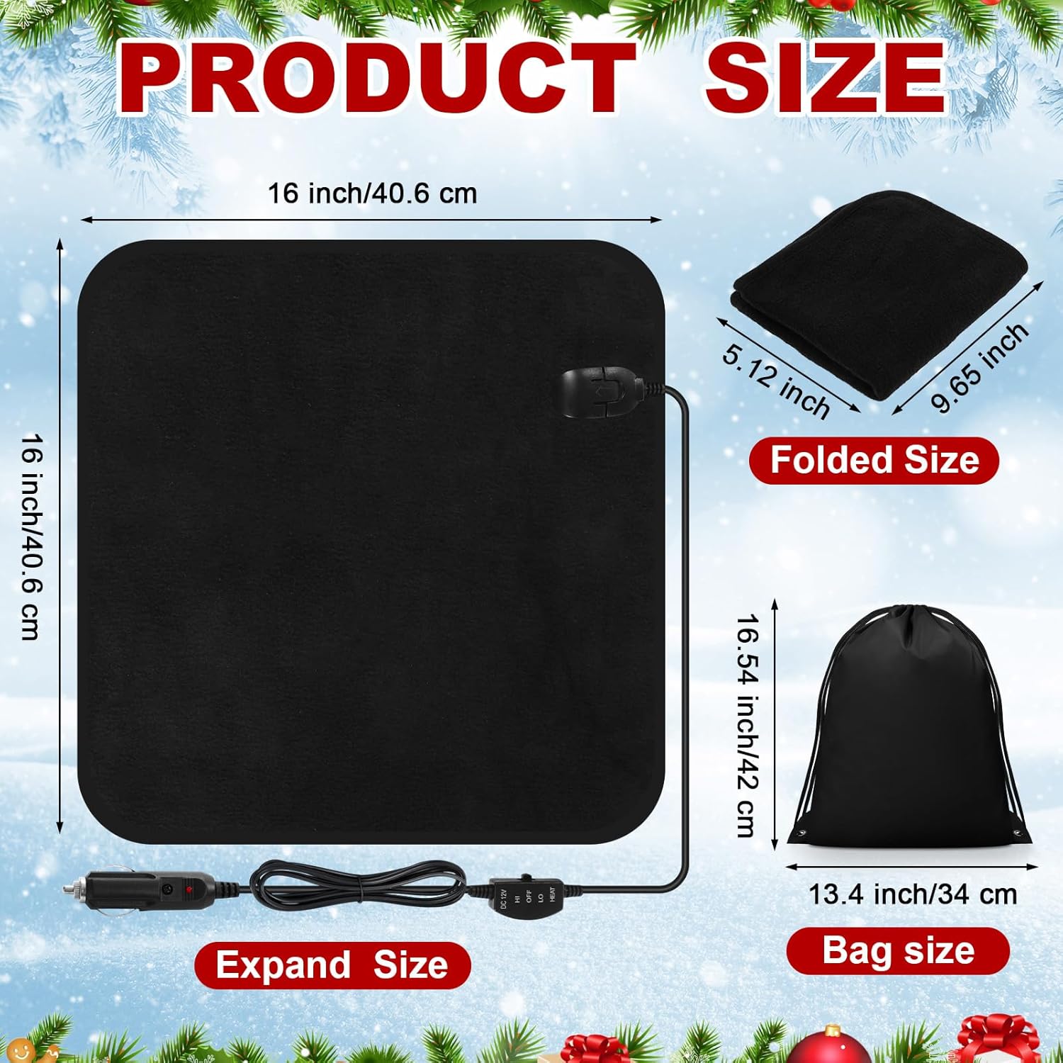 Nice Helper for Emergency: the heated blanket for car is approx. 16 x 16 inches, able to be quickly heated in 3 to 5 minutes; Moreover, there is a temperature controller for you to adjust the temperature according to your actual needs;Caution: Do not use while sleeping, leaving the vehicle, or when unattended. Always unplug the power cord from the cigarette lighter socket after use