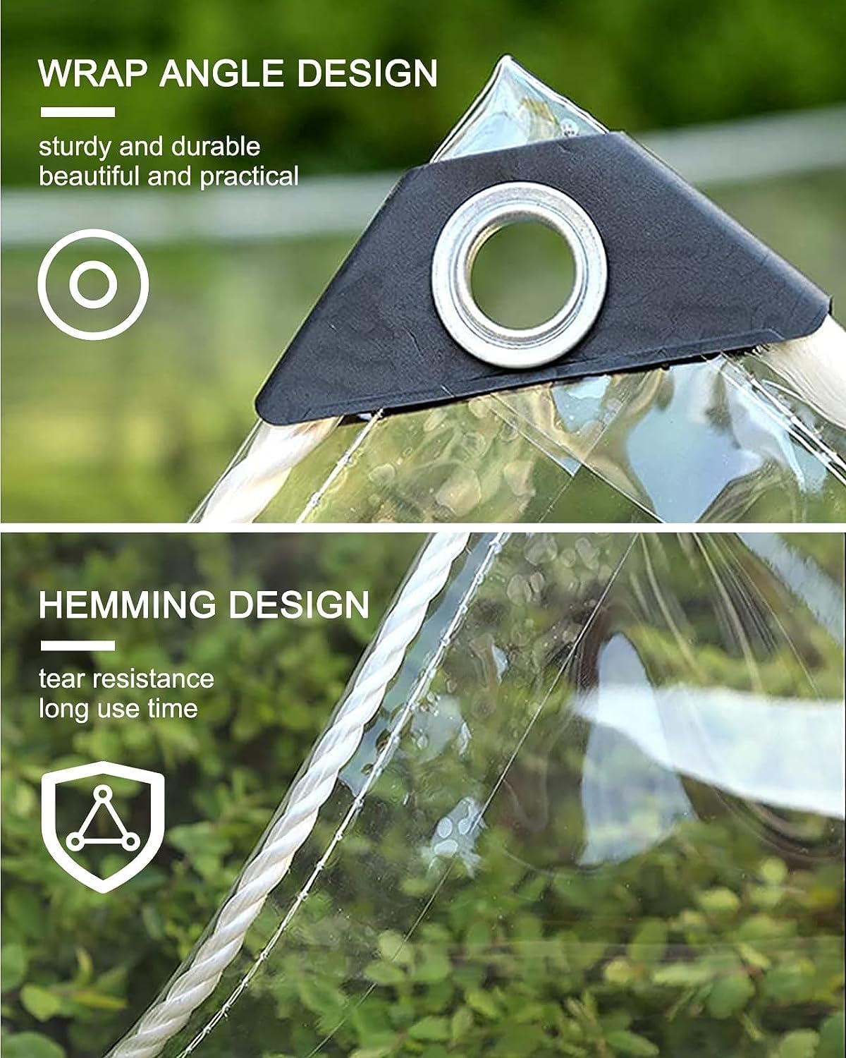 【CLEAR TARP WITH GROMMETS】Clear tarps heavy duty waterproof stronger and more durable than on the market such as copper holes.Do not worry about the deformation of the PVC tarp covers,no shrink or attenuation.Because Rainproof tarp has a 5cm reinforced edge, it can prevent the product from being torn by the wind, and improve durability and safety.All Season Use!
