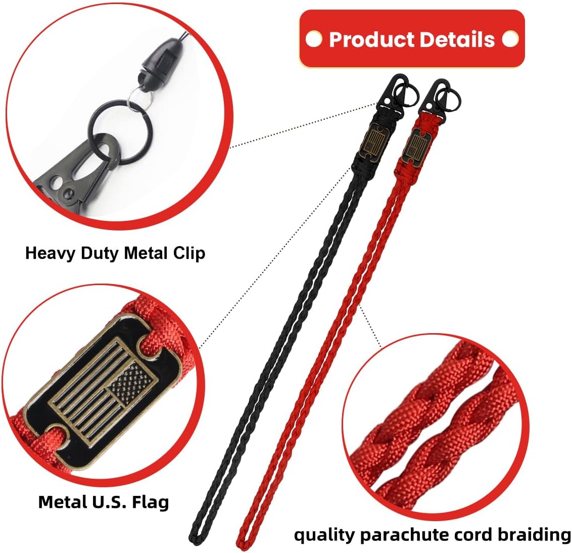 In this set of packaging, including paracord lanyard keychain with USA flag, long/short heavy duty lanyard a total of 4 pieces, and 4 pieces of small accessories suitable for key chain lanyards. Two colors, sufficient quantity, perfect for you to use and change when you have outdoor activities, field trips.
