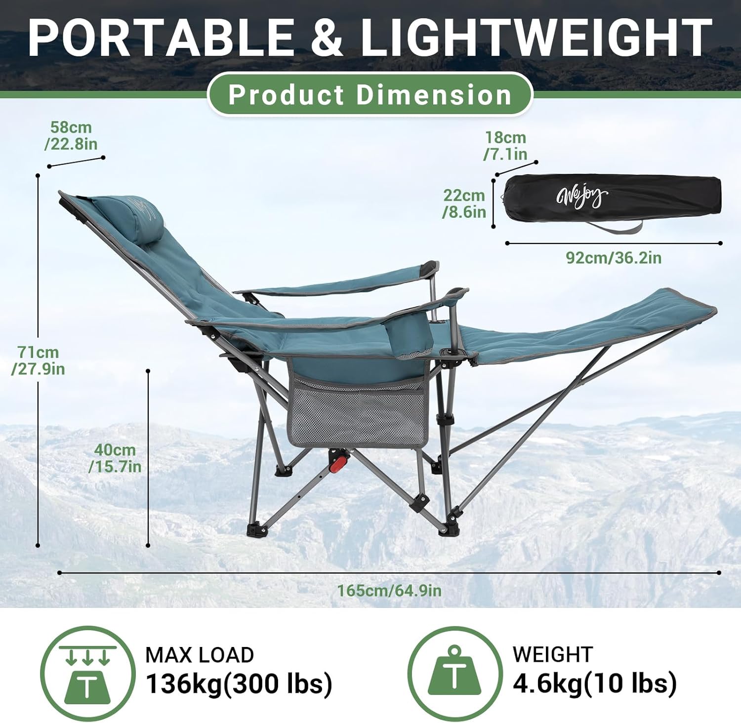 2-IN-1 CAMPING CHAIR: The footrest of the reclining camping chair is retractable and can be used as both a lightweight camping chair and a recliner. The backrest can be adjusted at 3 different angles, making it suitable for various scenarios such as the beach, lawn, camping, and parties, etc.
