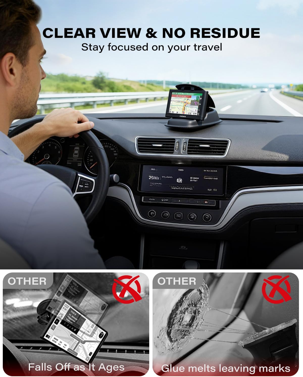 Spring Lock Clamp Holder: Fits most 3–6 inch GPS units and cell phones, with a unique anti-slip jello block under the mount that sticks securely to your dashboard. (Remove film before use for maximum grip.) Removable and easy to clean with water, and easily transferable from car to car