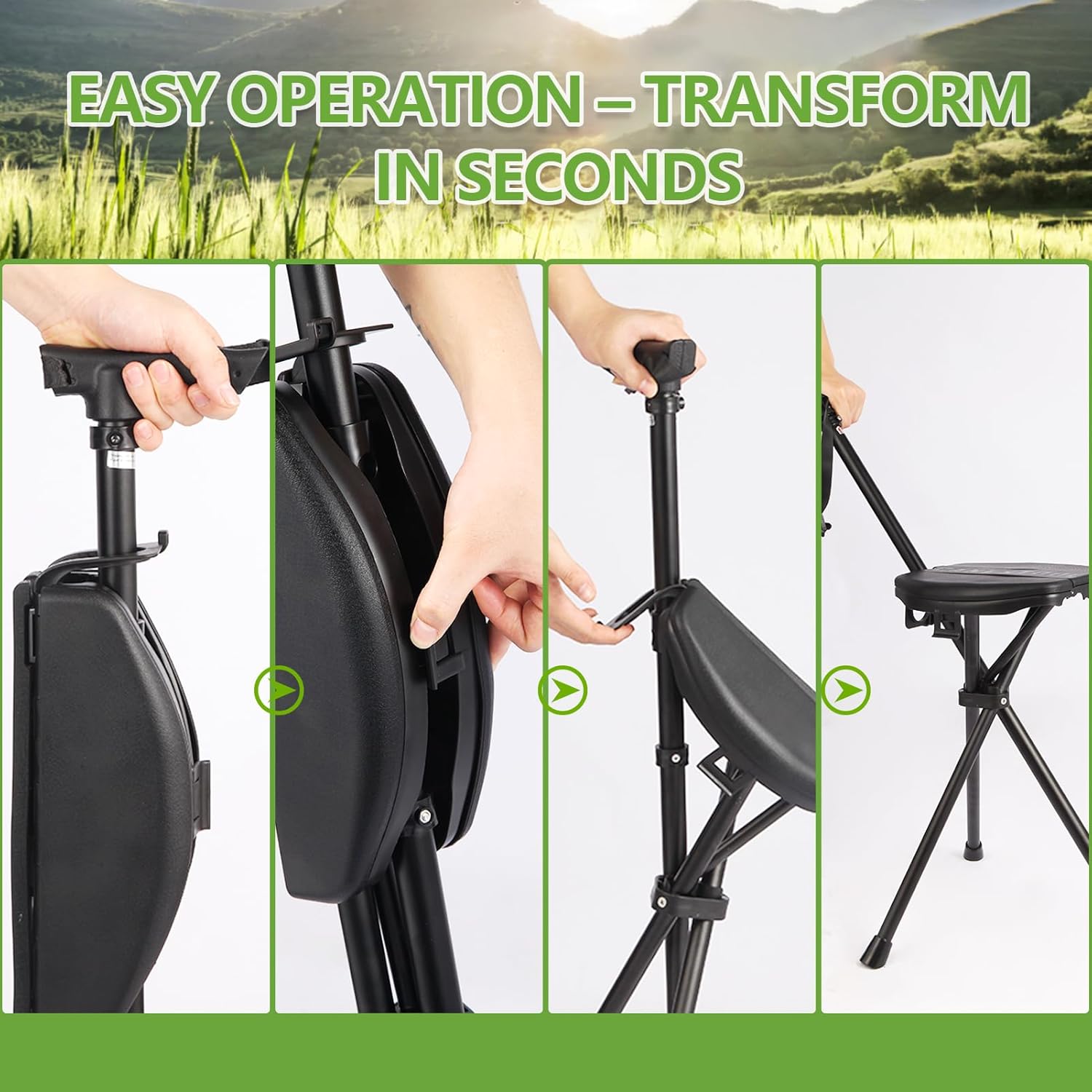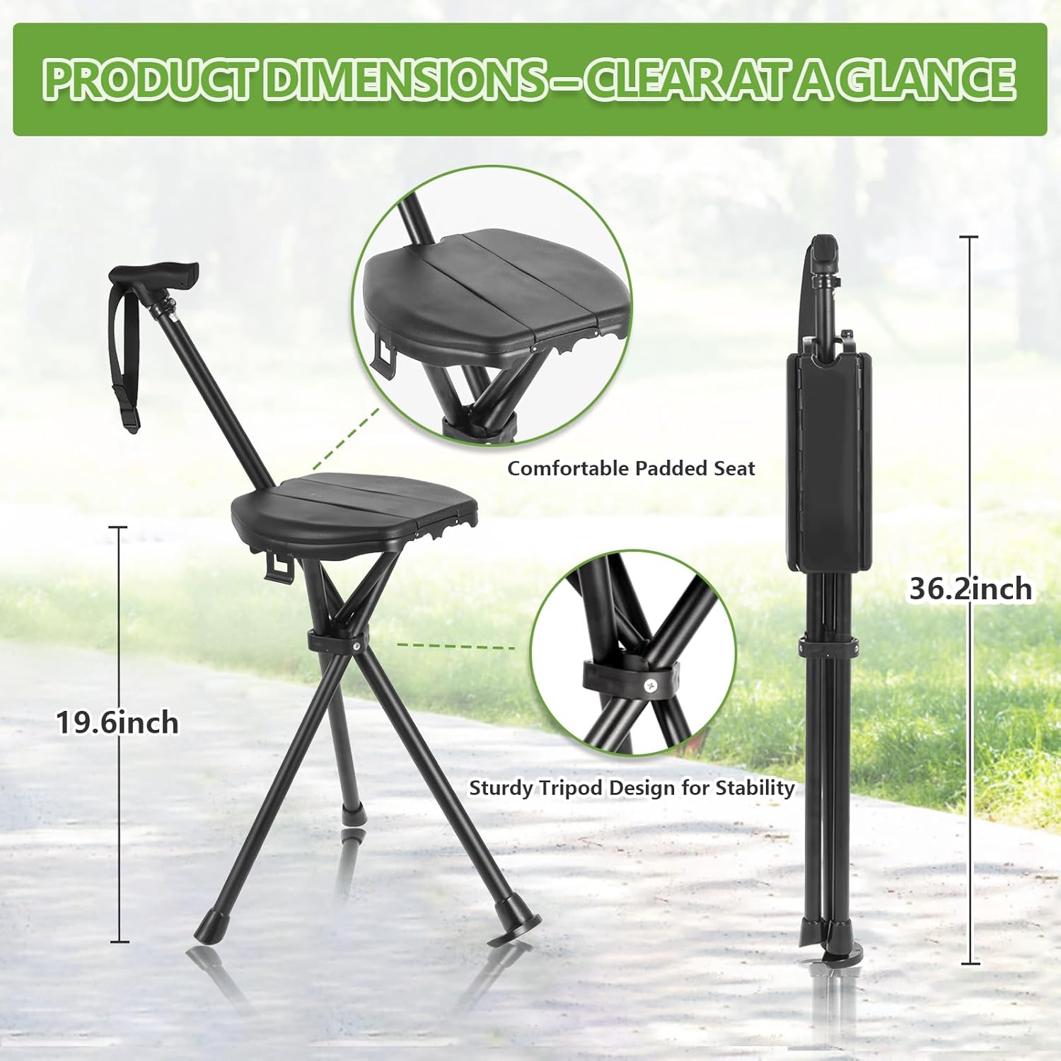 Portable Folding Walking Stick Chair: Tired of searching for a place to rest during your outdoor adventures? Discover the game-changing folding walking stick chair that seamlessly combines the functionality of a sturdy walking stick and a comfortable seat! With a simple click, transform this compact walking aid into a reliable chair, offering instant relief for your tired legs and knees anywhere, anytime.