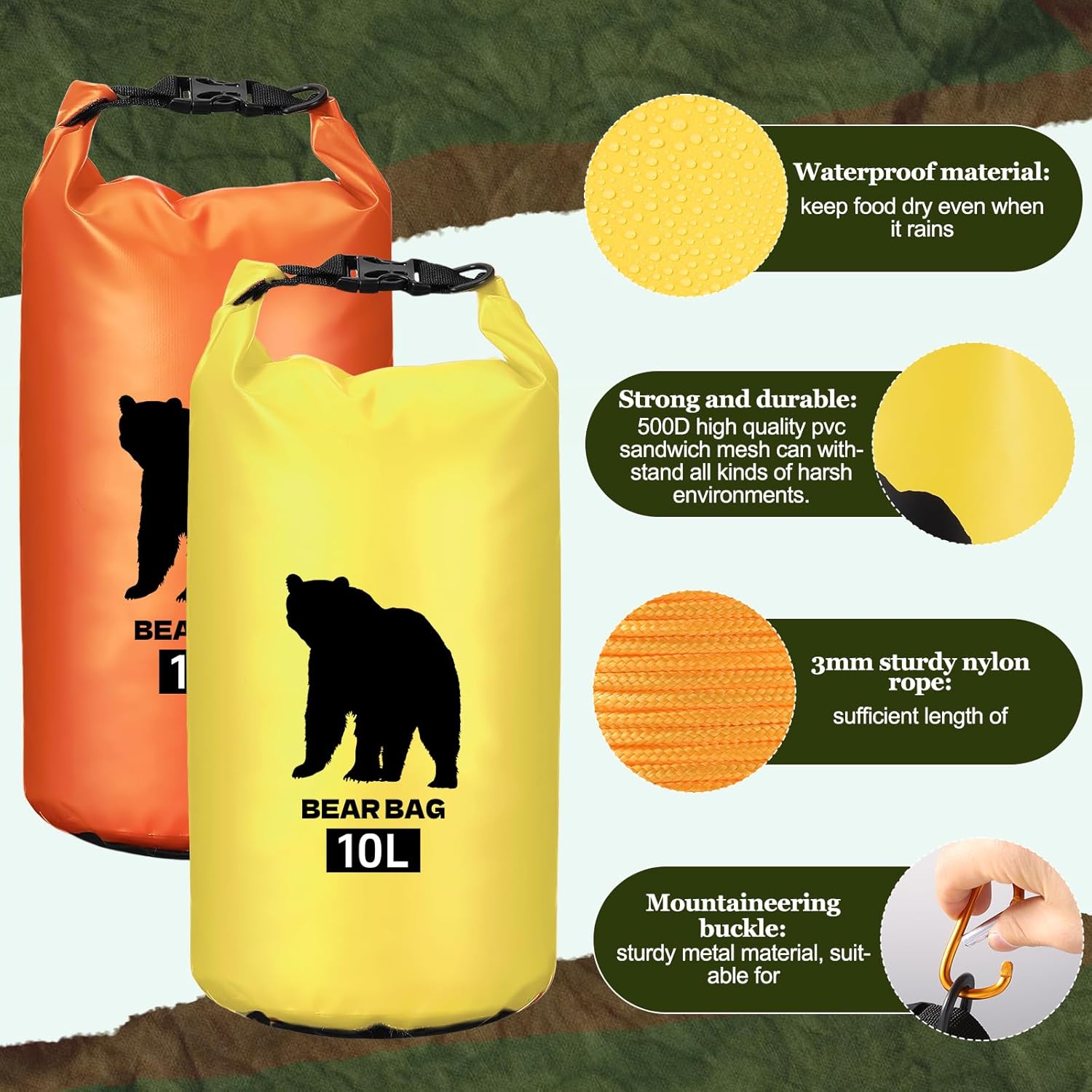 【Large Capacity and Size】Our bear bags have a 10L capacity each, perfect for weekend trips and holding toiletries. The 32.81 ft/10 m ropes provide ample length to secure your bag, while the 7.09 x 4.72 inches/18 x 12 cm rock pouches are ideal for weighing down the ropes.