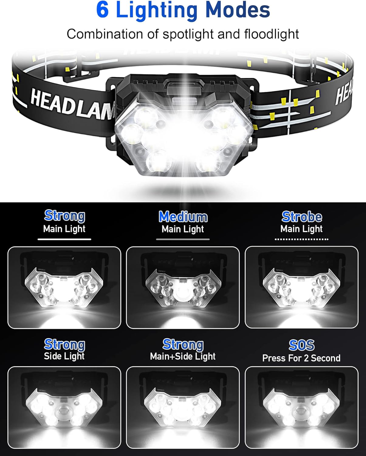 [6 VERSATILE MODES] – The headlamp has 6 lighting modes: Main light (strong/medium/strobe), Side light (strong), All light on. In addition, you can press and hold the switch for 3 seconds to turn on SOS mode. Choose the right mode according to the different scenes!