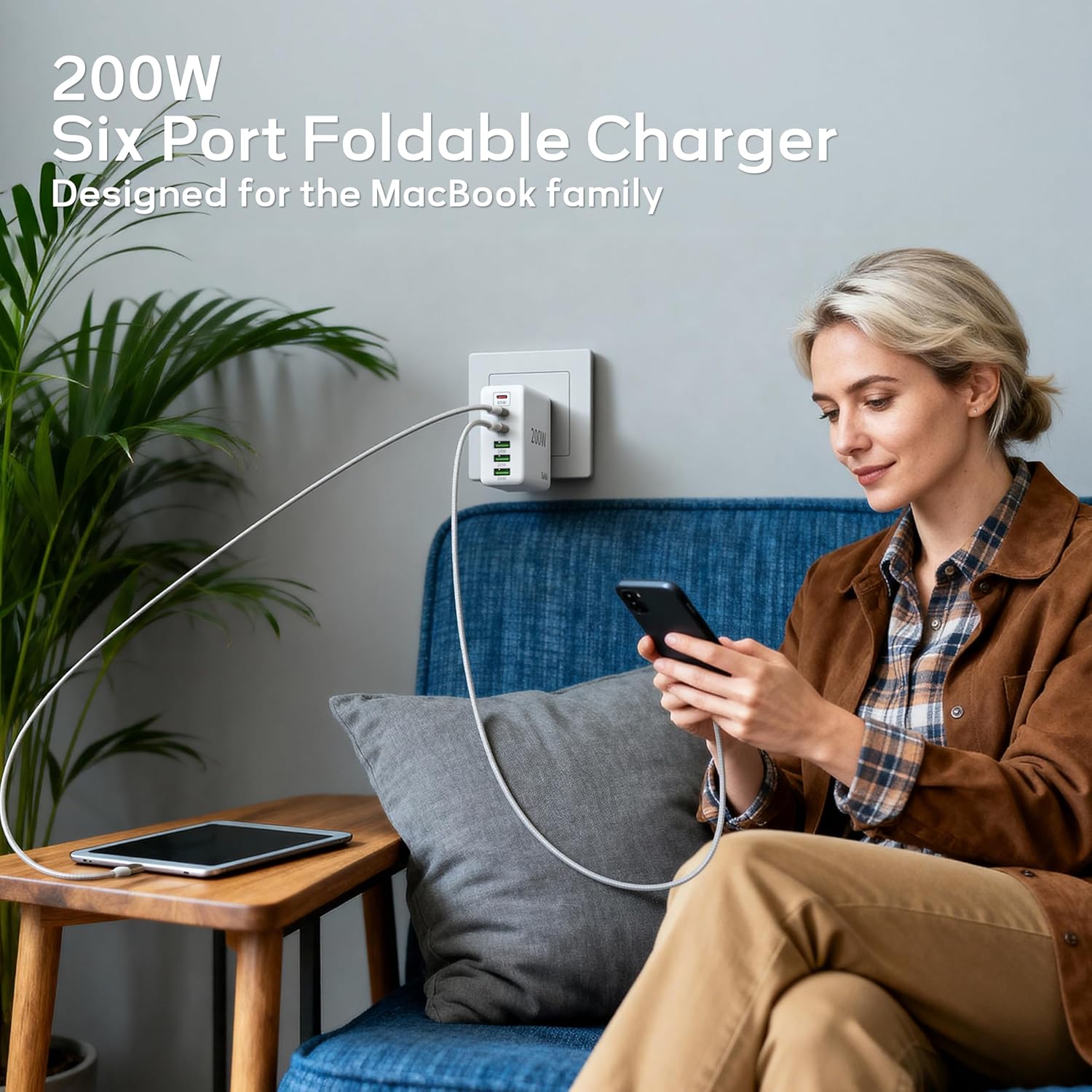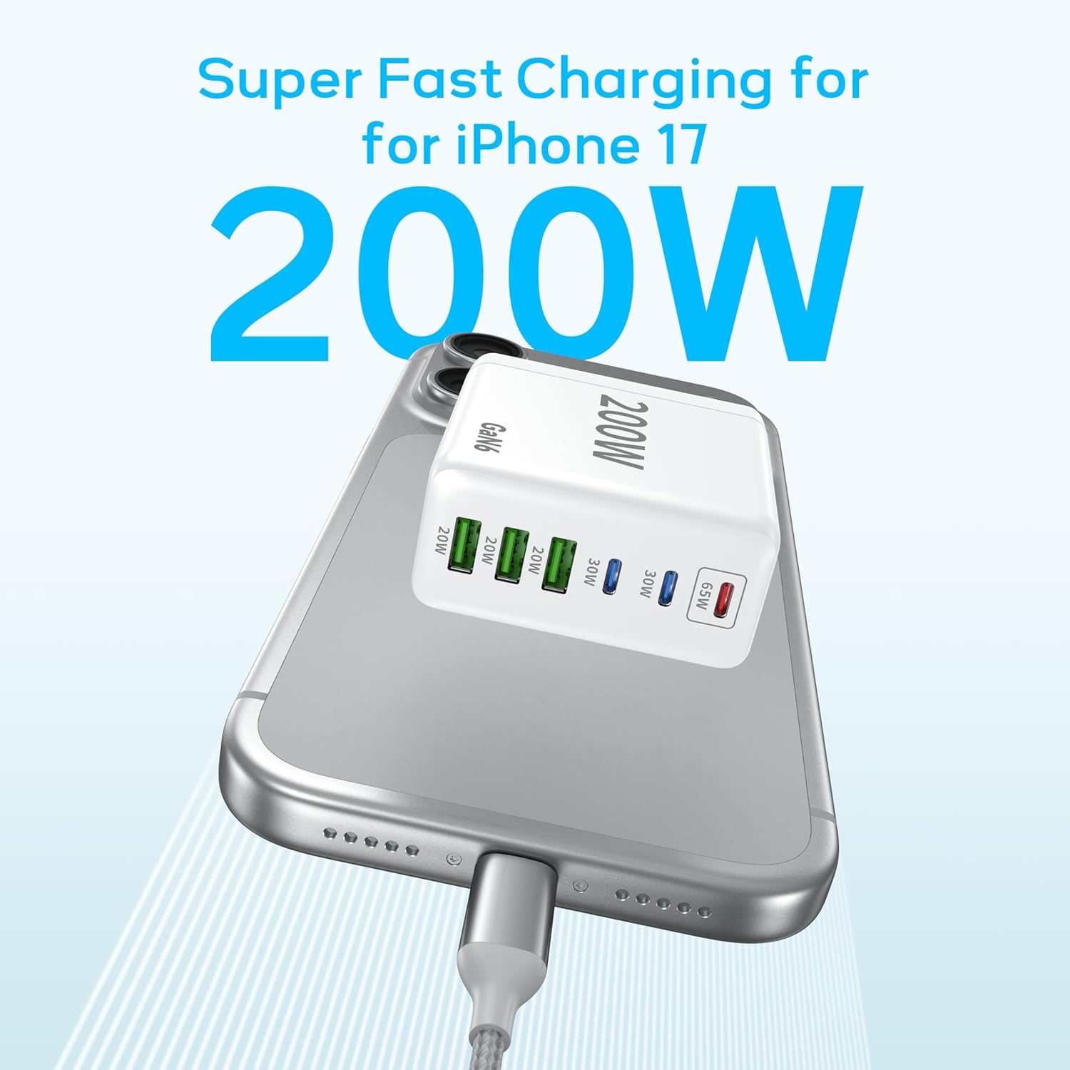 【Fast-Speed Charging】 It with total 200 watt power. 65W PD PPS. 6 port . 3 USB C port and 3 USB A .30W x 2 USB C and 1x65W USB-C Power Delivery Compatible with Smartphone, Tablet, and Laptop, Work For MacBook Pro 13”/ MacBook Pro MacBook Air MacBook iPhone 17 16 15 Pro max 14/14PLUS/14PRO/14PRO MAX 13/ 13 Mini/ 13 Pro/ 13 Pro Max iPhone 12/ 12 Mini/ 12 Pro/ 12 Pro Max/ Samsung Galaxy S21+/ S21/ S21 Ultra/ S21 FE/ S20+/ S20/Dell XPS 15/ 13 Google Pixel iPad Pro 12.9”/ iPad Pro 10.5”/ iPad Pro 11”/ iPad Mini Series/ iPad Air Series AirPods Pro.more up to 3× faster than with an original old charger. 3 X20W USB A fast charger port for your other devices