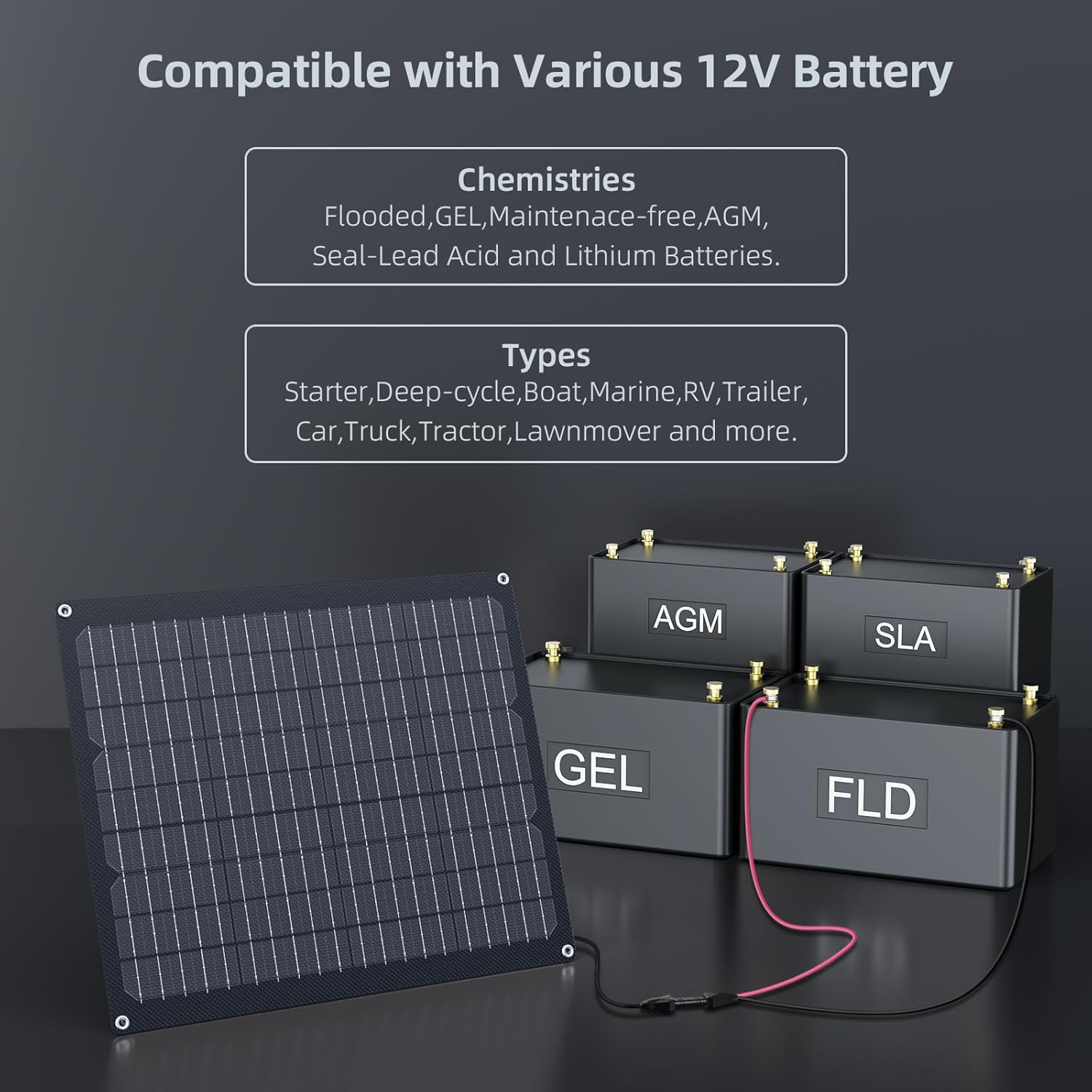 【Solar Battery Charger for Various 12V Batteries】: Our solar trickle charger for car battery 12V is designed to keep your 12V rechargeable batteries charged and maintained, perfect for vehicles that aren’t frequently used, such as car boat RV camper and lawnmowers etc, It ensures your devices are always ready to go, preventing battery drain over time. Compatible with various battery types, including sealed lead-acid, deep cycle, LiFePO4, GEL, AGM, and flooded batteries etc