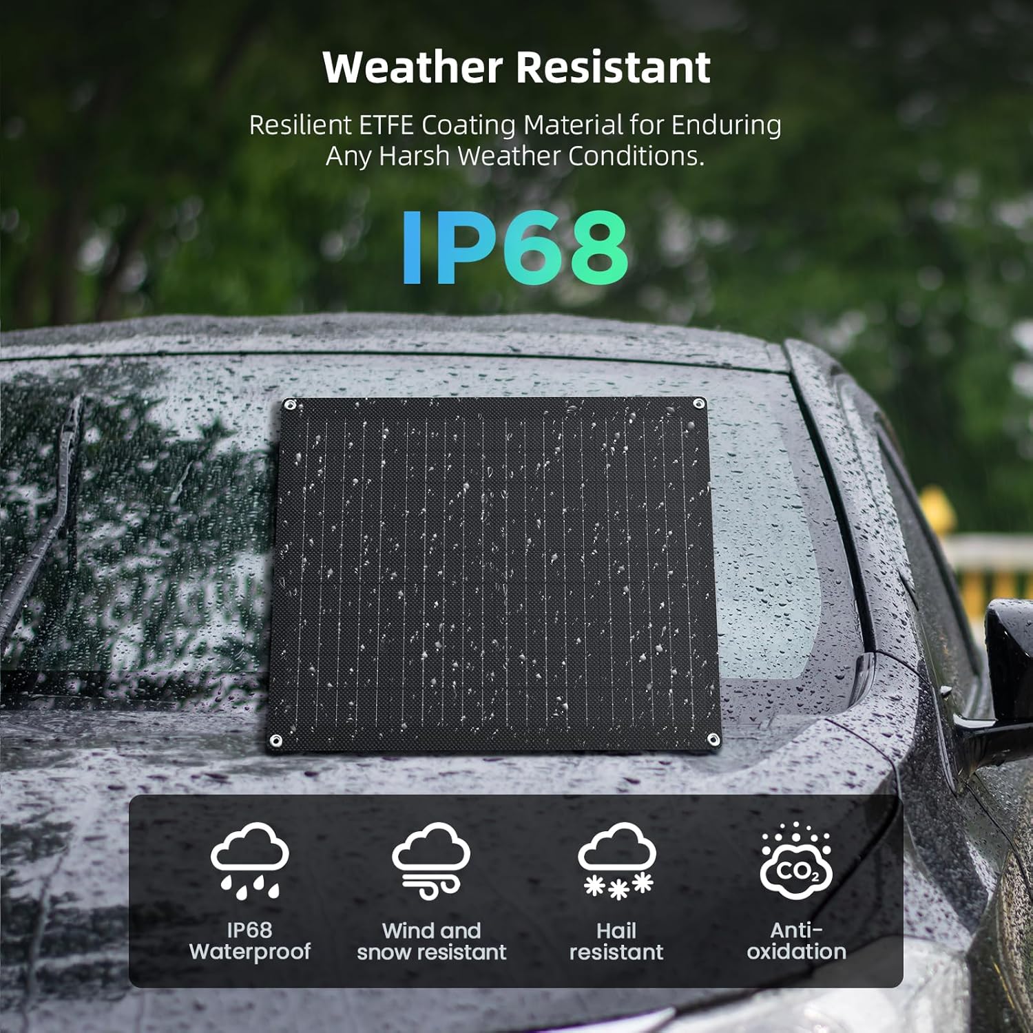 【IP68 Waterproof】:Experience unparalleled durability and performance with our solar powered battery charger , designed to thrive in the harsh outdoor conditions. Featuring a robust ETFE coating, this solar powered battery maintainer boasts an IP68 waterproof rating. Whether it’s heavy rain, snow, hail, or sandstorms, the solar car battery charger maintainer’s superior protection shields it from the elements, guaranteeing reliable power generation over time