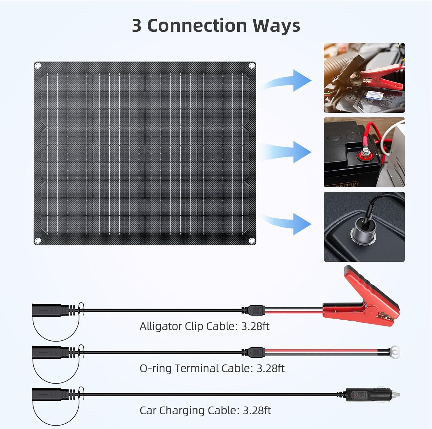 【3 Wiring Ways and Easy to Use】:Charge your 12V battery effortlessly with our solar 12V solar panel , which includes three convenient cables: alligator clip cable, car charging cable, and O-ring terminal cable. All cables are plug-and-play for easy setup. The trainer solar battery charger also features three LED indicators to keep you informed of the charging status all the time