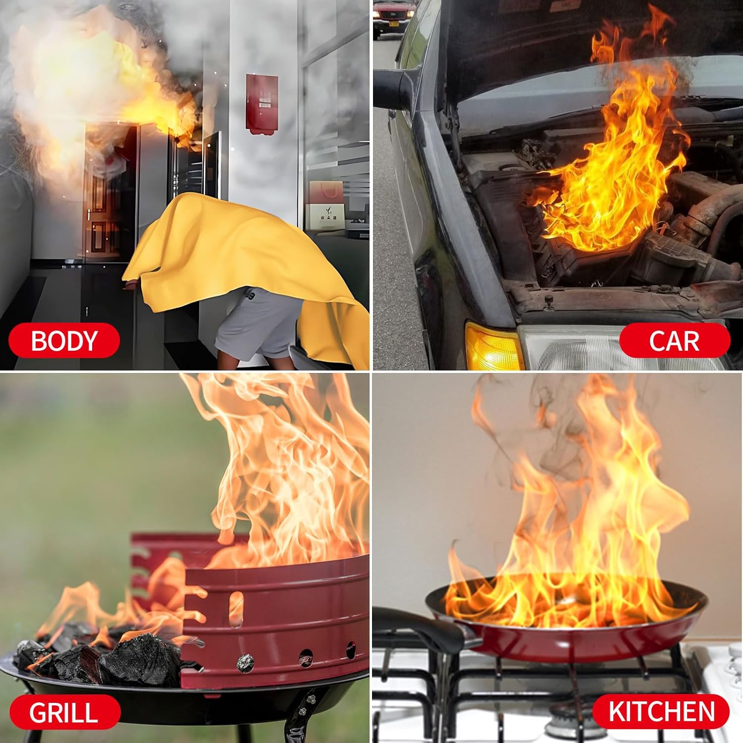 BE PREPARED: The fire blanket for home can also play a great role in different types of fires, it can also be used as grill mats for outdoor grill, If the fire can not be extinguished, it can be draped over the body to escape. A must-have fire extinguisher in your kitchen, backyard, and vehicle survival kit