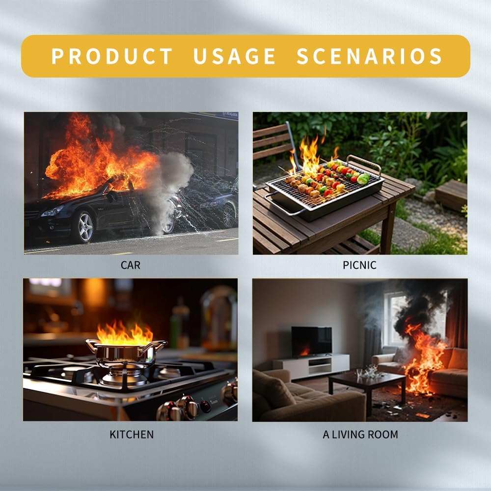 π Multi-Scenario Protection, Peace of Mind: Compact and lightweight, the packaging includes hanging holes for easy storage in the kitchen, living room, car trunk, office, or RV. It provides on-the-go initial fire response for various scenarios such as cooking, camping, and road trips.