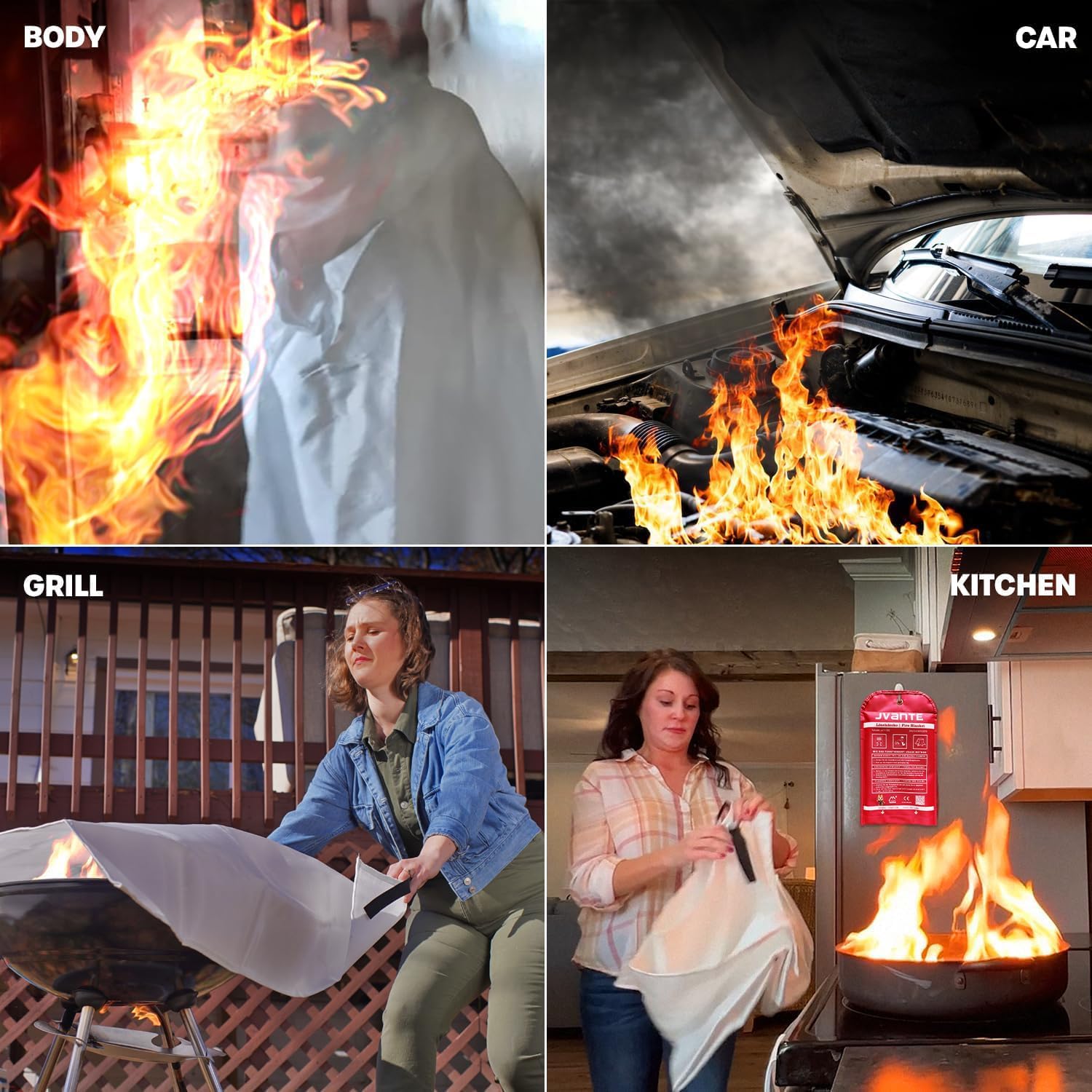 π₯ Two-Sided Usability, Versatile Application: Our fire blanket features a dual-sided protective design, eliminating the need to distinguish between the front and back sides during use. Either side can efficiently extinguish flames upon contact with the fire source. It is not only an effective tool for suppressing initial fires such as grease pan or electrical fires but can also be wrapped around the body as an emergency heat-resistant escape blanket during critical moments, providing essential protection for evacuating a fire scene.
