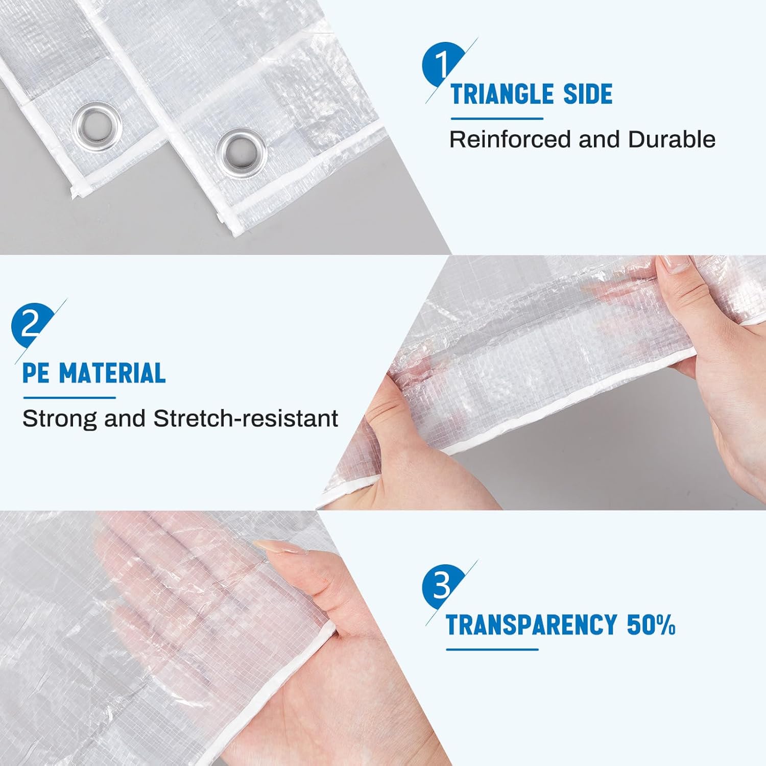 PE Material: made of durable PE material, these waterproof clear tarps with grommets are reusable and designed for long term use; PE material also ensures waterproof feature, making them proper for use even in wet weather such as rain or snow