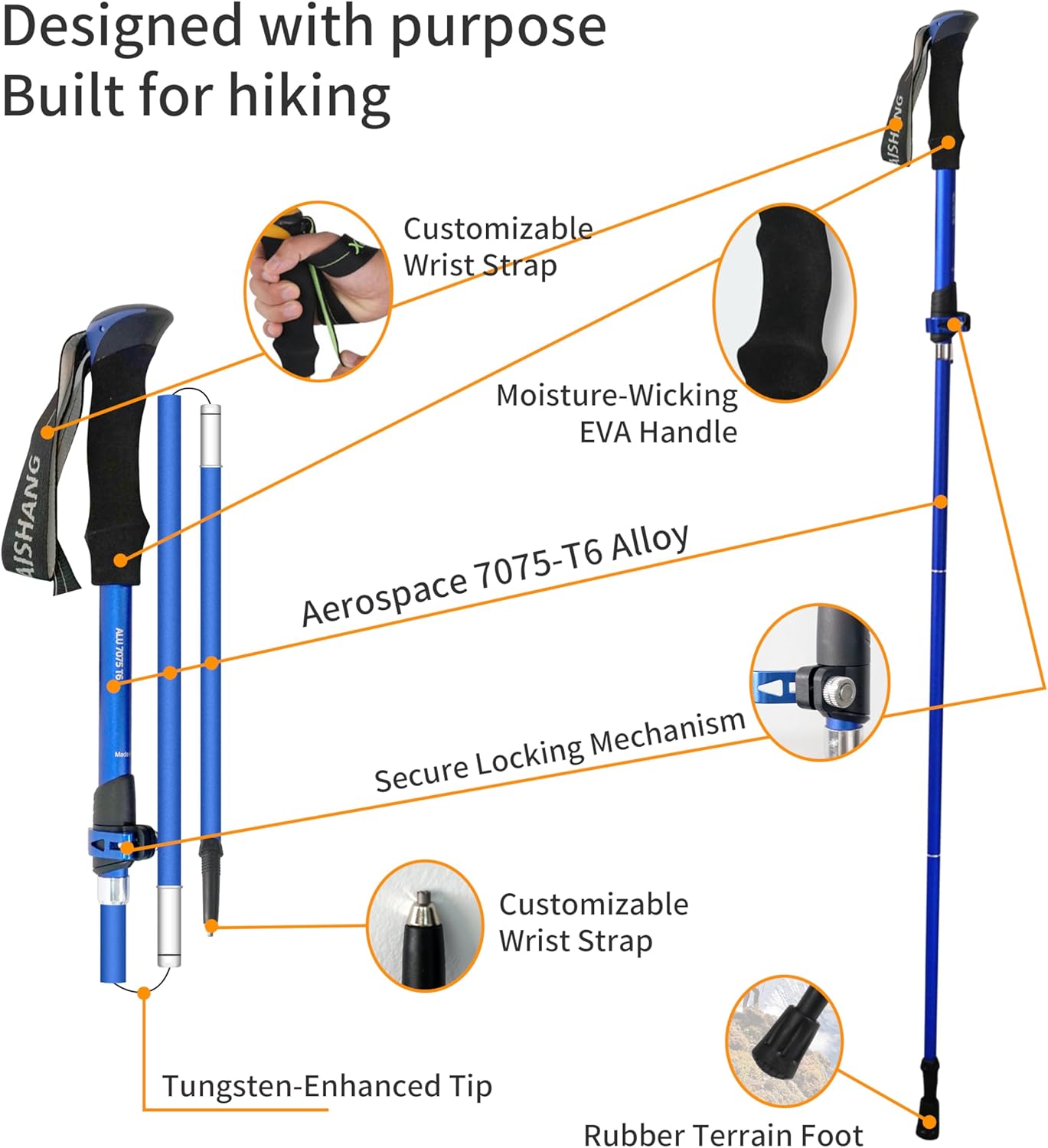 The main body of the hiking stick is made of 7075 aluminum alloy, which is lightweight and stable.The surface of the hiking stick is treated with sandblasting and oxidation, providing a comfortable texture and a luxurious, elegant appearance.The tip of the hiking stick is made of tungsten-titanium steel, which is highly durable and wear-resistant. Design