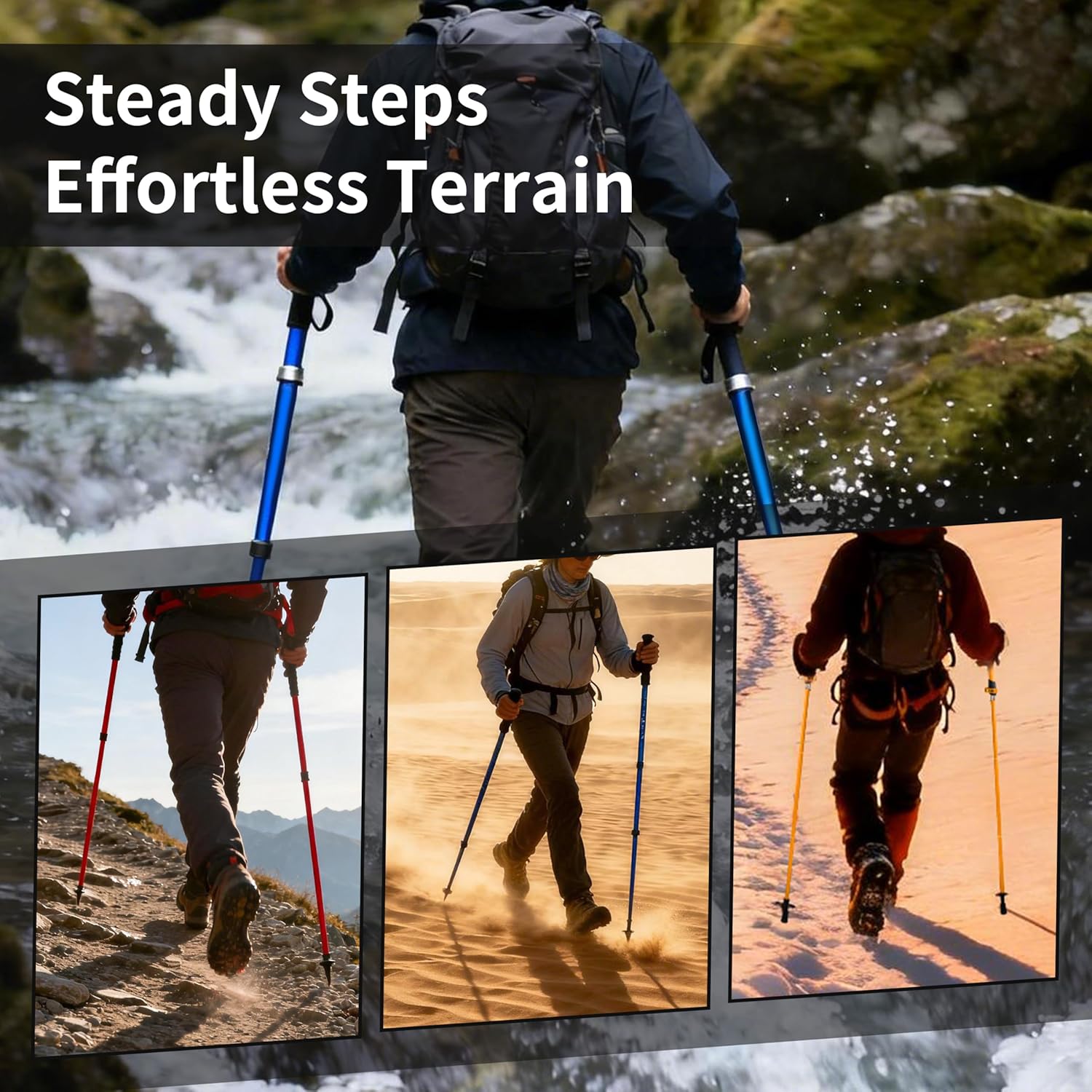 【Secure Metal Locking System】- Features an upgraded high-strength external metal lock. Adjust the length and lock it securely with one click, ensuring stability on tough terrains.