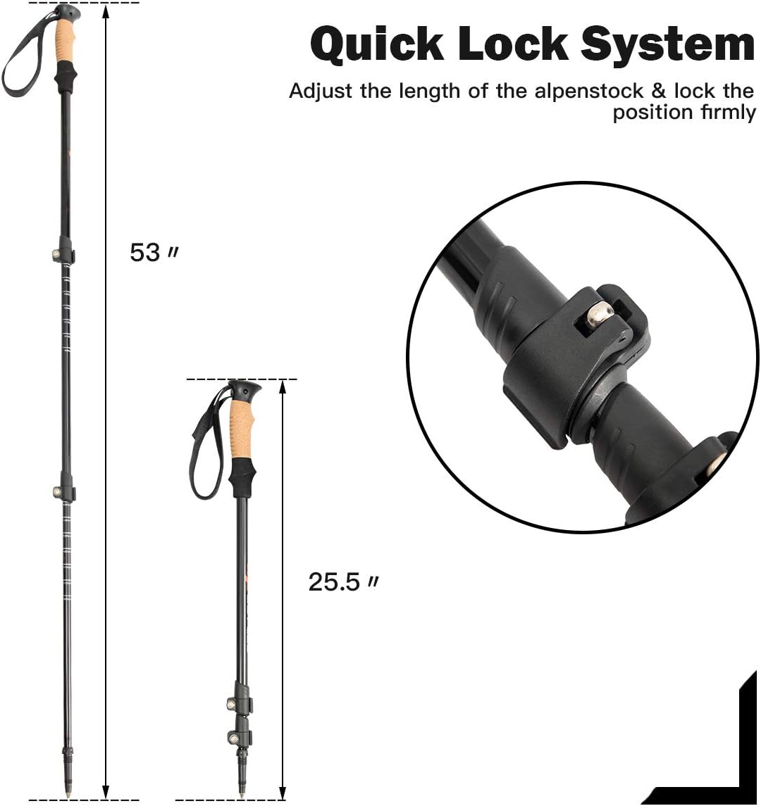 【Length Adjustable Alpenstock】 By rotating the quick lock system, the length of our alpenstock can be easily adjusted from 25.5’’ to 53’’. You can adjust it according to your height and terrain. Bring our high quality alpenstock to explore the world with your family.