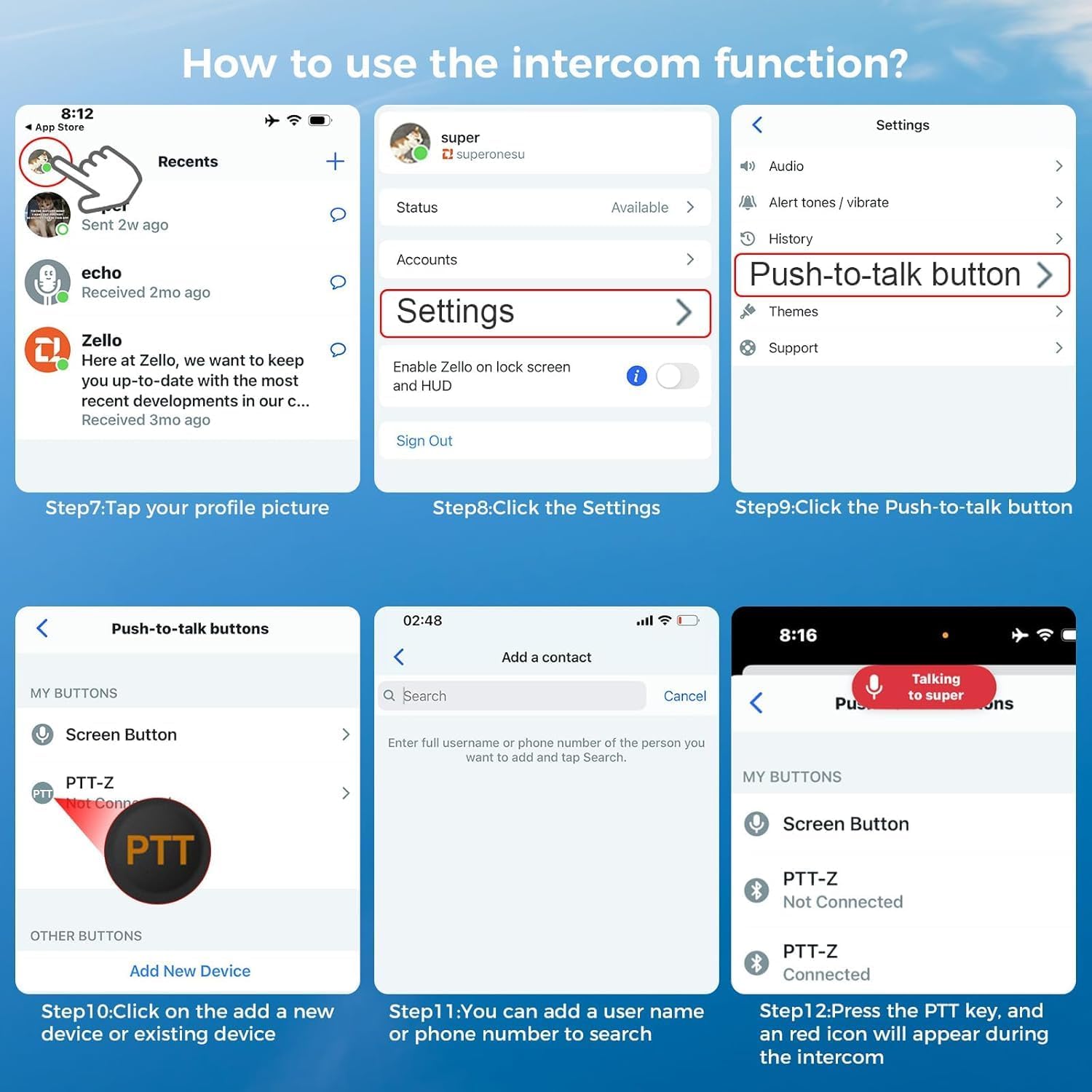 How to Activate the Walkie-talkie Function in the First Step?First, download and install the Zello app from the App Store register and log in. Once powered on, use your phone’s Bluetooth to search for and pair your WS15 device. Open the Zello app again, tap your profile picture, go to Settings, and select Push to Talk. Then, tap Add New Device in the app and briefly press the PTT button on your WS15 device until “PPT-Z” appears. Tap it to contact you want to call, and start the call.