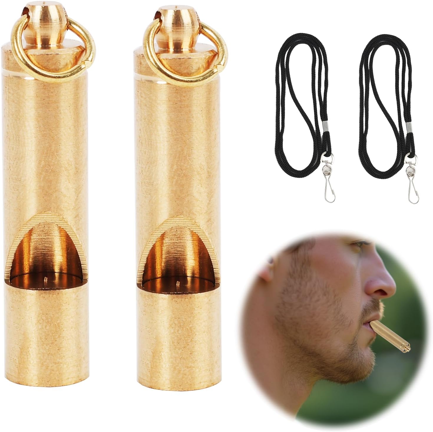 package includes: 2x brass whistles, 2x 30-inch lanyards