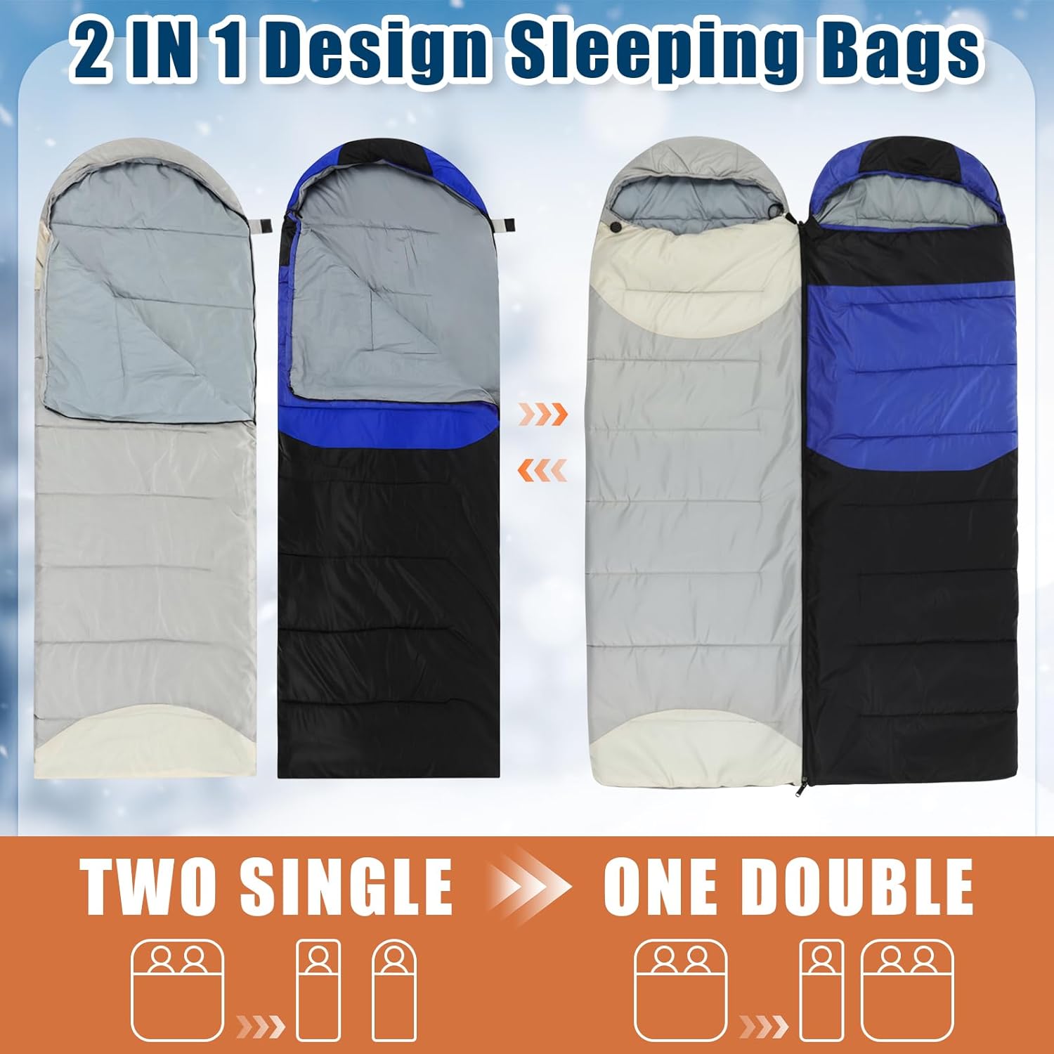 2-Pack Value for Couples Families: this 2-pack sleeping bag set saves cost and doubles your options; Zip two bags into a double sleeping bag or use separately; Includes dual USB ports and is machine washable, perfect for camping gifts or emergency kits