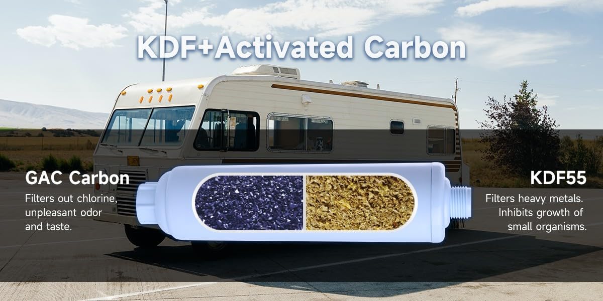 ✅ EFFICIENCY FILTRATION: RV water filters utilize a combination of GAC (Granular Activated Carbon) and KDF (Kinetic Degradation Fluxion) filtration technology to effectively remove residual chlorine, odor, taste, and sediment from water. Independently tested and verified, it can remove up to 98.91% of chlorine and improve the smell and taste of water. It is one of the campers must have RV accessories for outside.