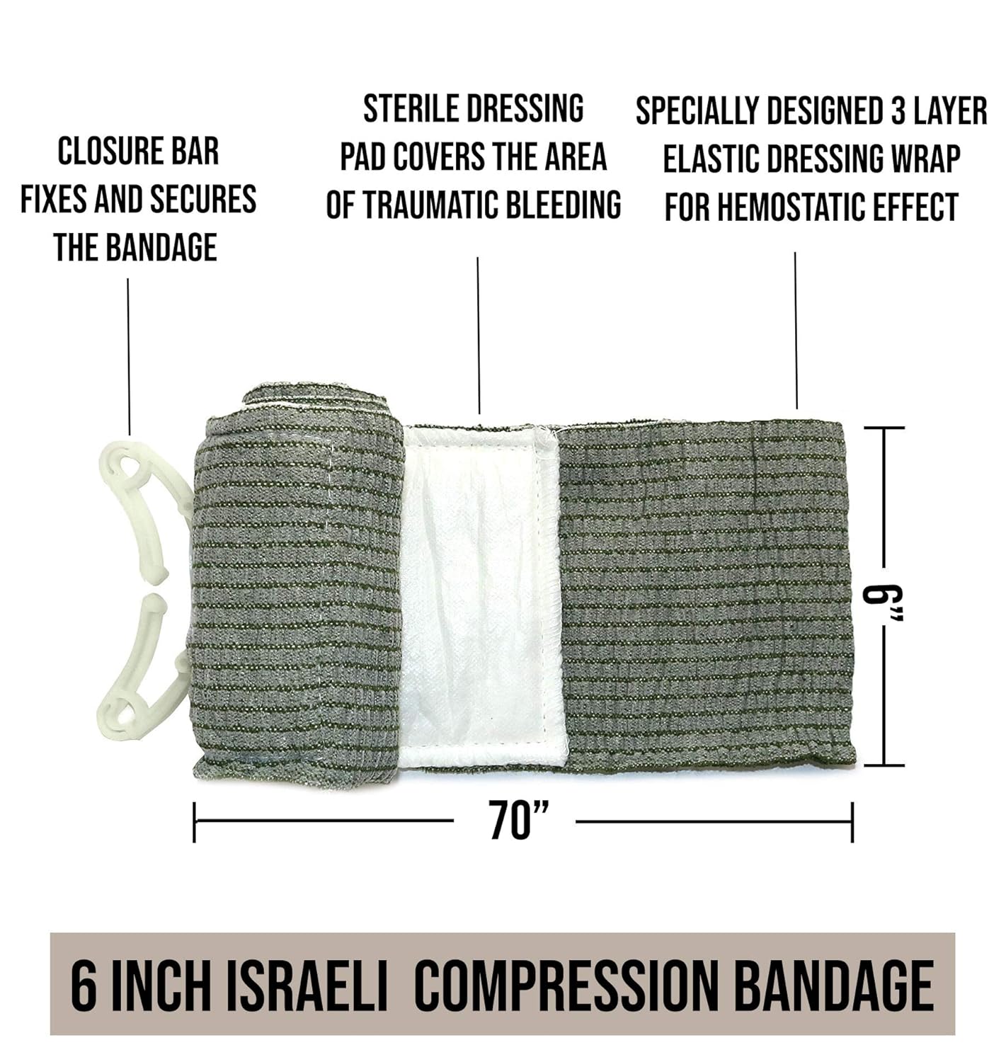 MULTIFUNCTIONAL FIRST AID DEVICE: The Israeli compression bandage can be applied to multiple parts of the body including: arms, legs, torso, head, and anywhere else. You can even use this bandage as rings, splints, and a simple tourniquet in an emergency. It exceeds the design of a general first aid bandage. The pressure-integrated device is equivalent to a small emergency system. It is widely used by the military, first responders, EMS, law enforcement, commercial and industrial sites.