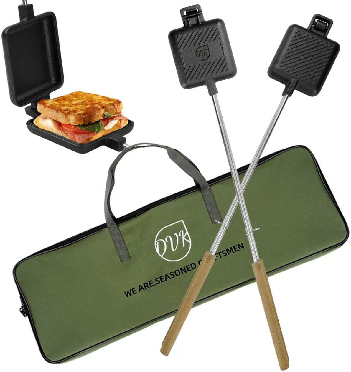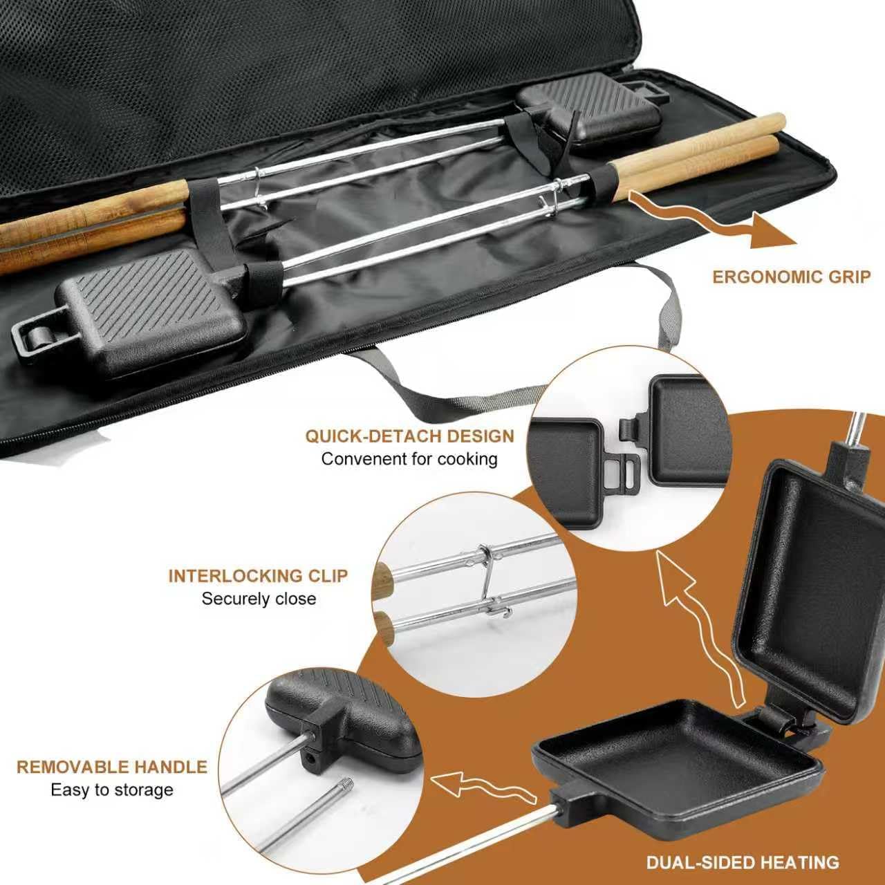 Long Heat-Resistant Handles:Ergonomic 22.6” wooden handles keep your hands safe and cool while easily flipping pies or sandwiches over campfires or grills.