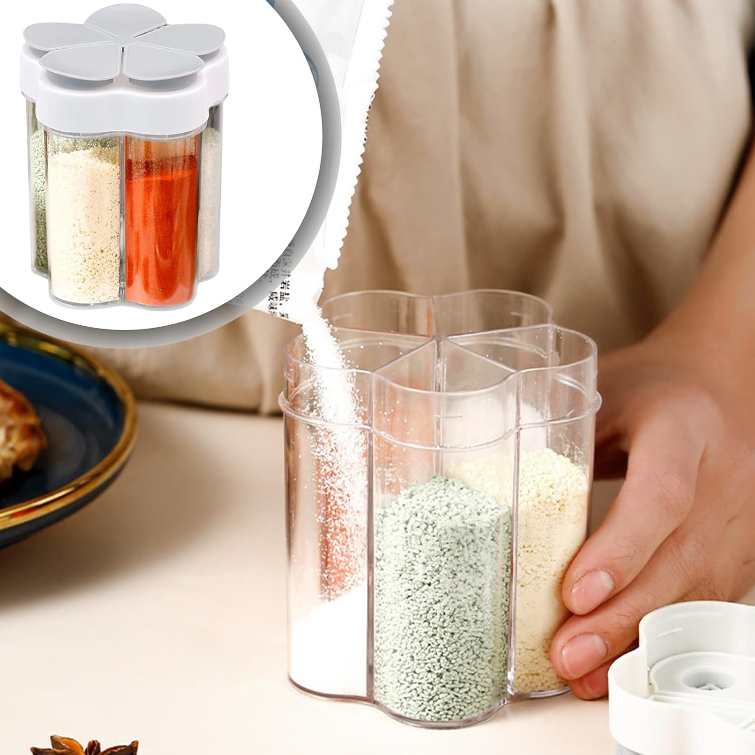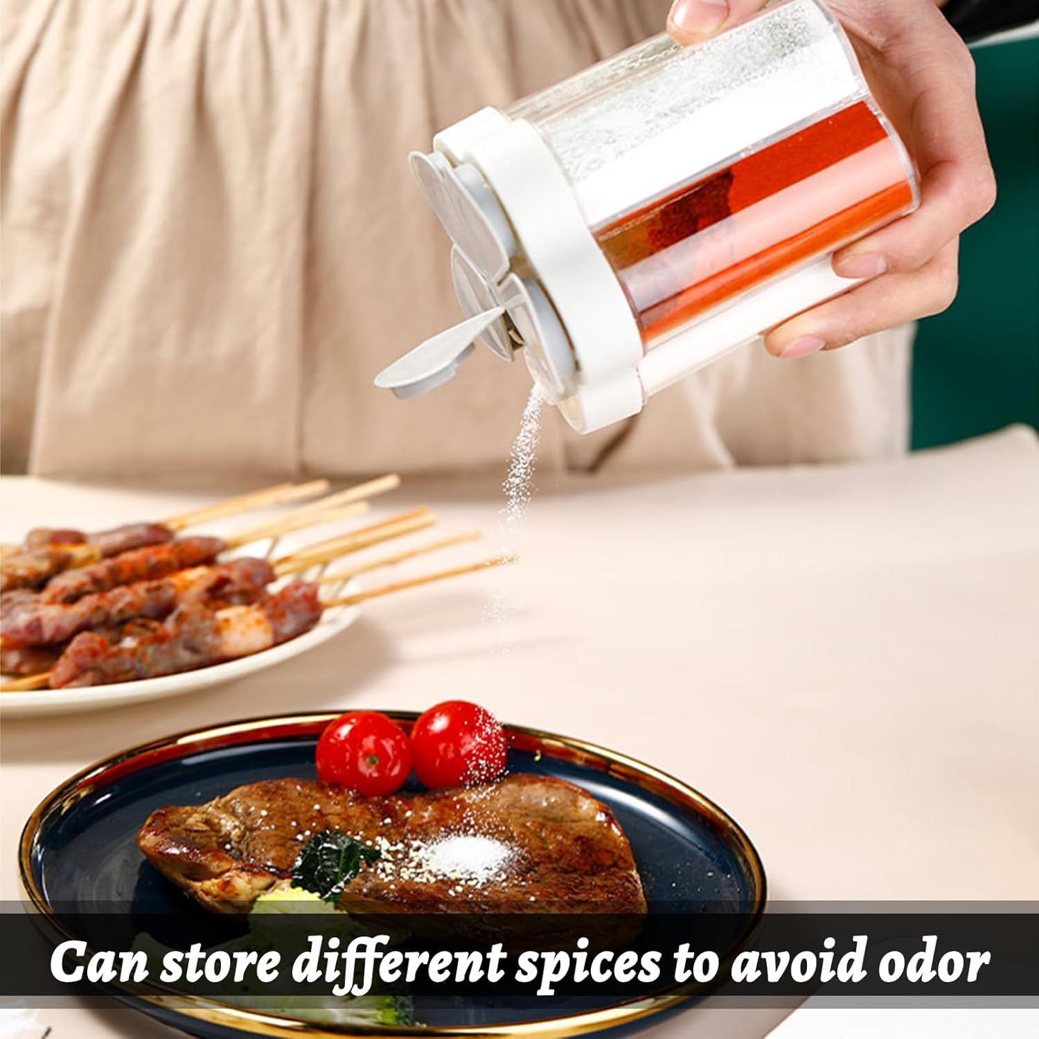 【Bottle mouth design】Each compartment of seasoning keychain corresponds to a lid, and the lid is opened with a mesh design. When using, you can evenly distribute the seasoning, control the amount and filter out the agglomerated seasoning. Especially suitable for kitchen novices.