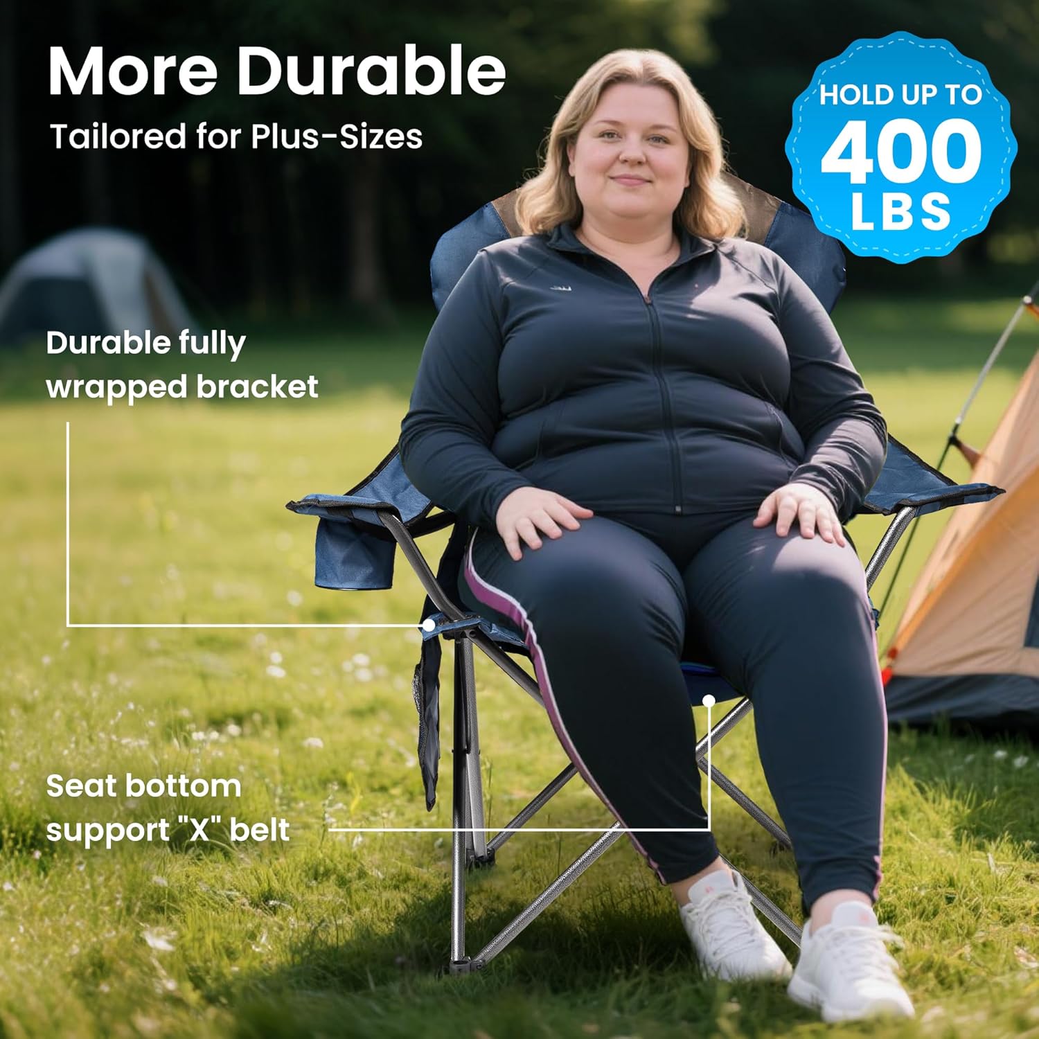 Ergonomic Camping Chair with Lumbar Support: Experience premium comfort with height-adjustable armrests, waist strap, and full-back padded design. The ergonomic high backrest and oversized seating area provide full-body support for camping, fishing, or backyard relaxation