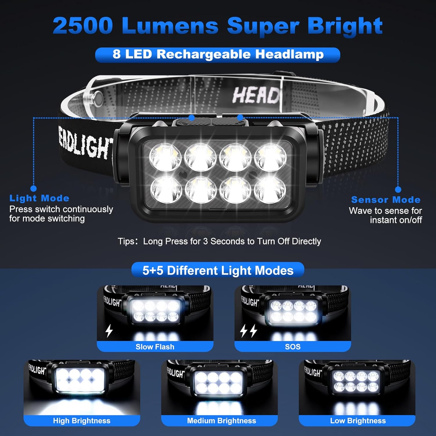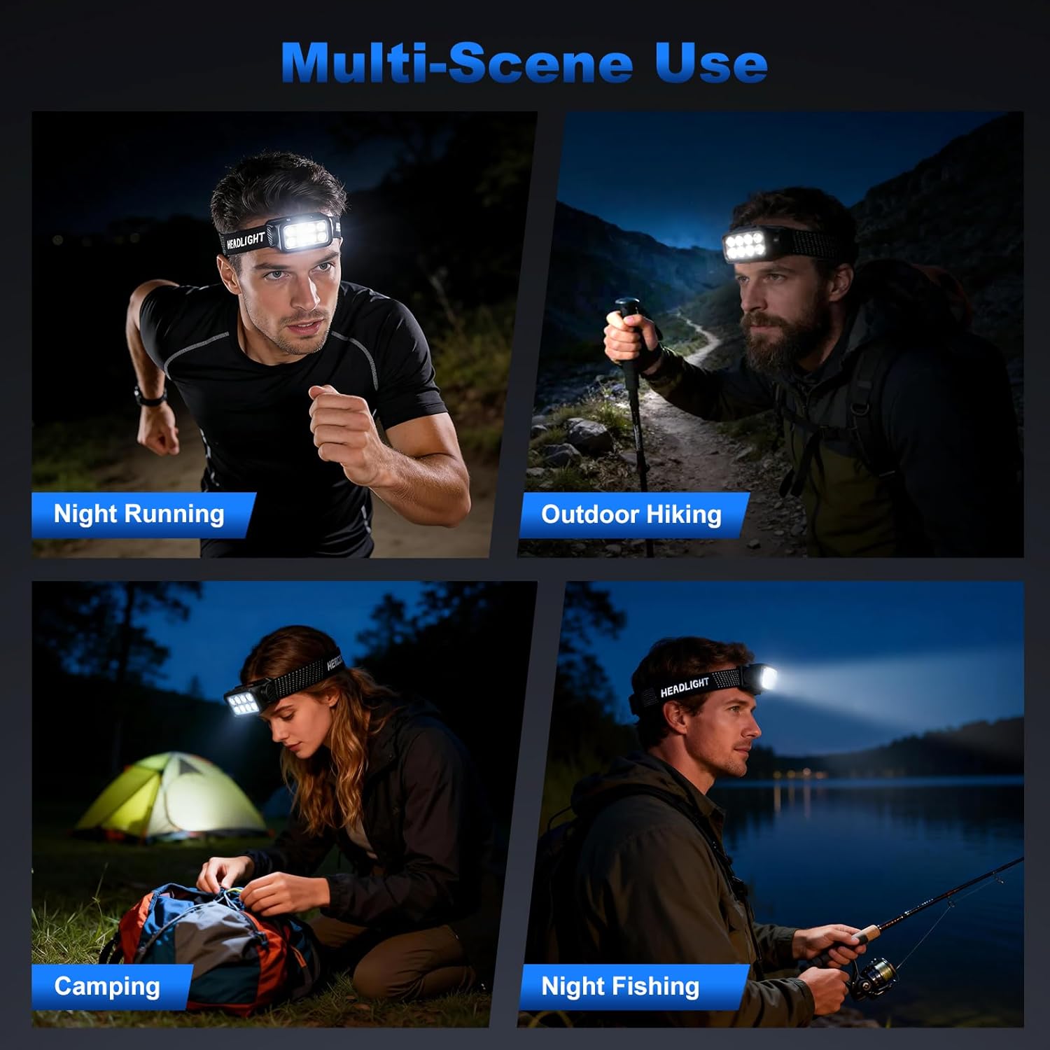 Power Display & Elastic Headband: This headlamp includes a battery level display that lets you monitor power usage in real time. It offers 10 lighting modes—5 standard modes and 5 motion-sensor modes—including high beam, medium beam, low beam, strobe, and SOS. These options ensure stable and reliable illumination in any environment, providing confidence and safety during your adventures. The headlamp also comes with an adjustable, high-elastic headband that is detachable and washable, making it suitable for users of all ages.