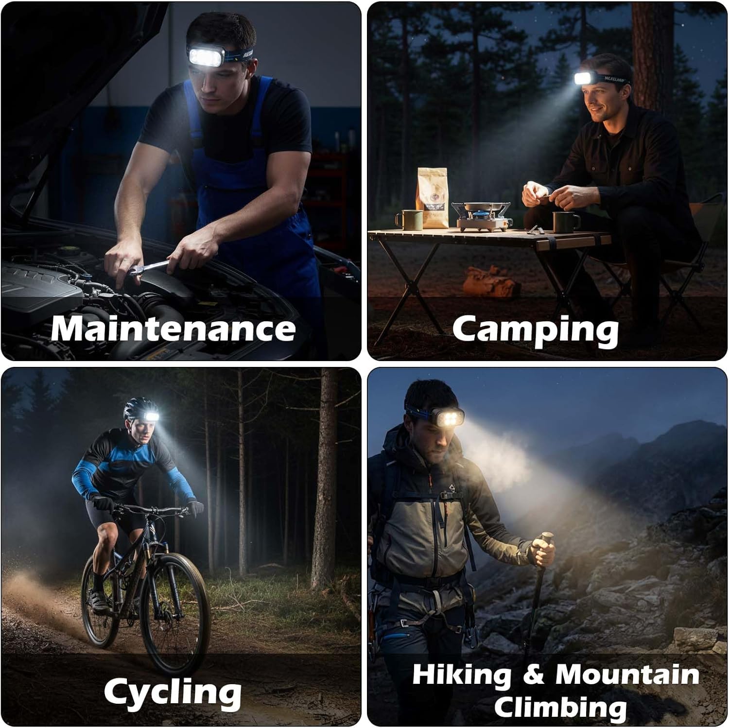 Waterproof & 12 Lighting Modes: The headlamp flashlight is built to IPX5 waterproof rating and shock-resistant design ensures normal operation even in bad weather for Ideal for outdoor activities such as camping, fishing and night hiking in bad weather.The headlamps for adults have 12 modes to suit all your needs. 6 LED key modes and 6 motion sensor modes, you can easily turn on/off the light by waving your hand.Head lights key modes include spotlight high brightness, spotlight low brightness, floodlight high brightness, floodlight low brightness, red light and red light strobe mode.