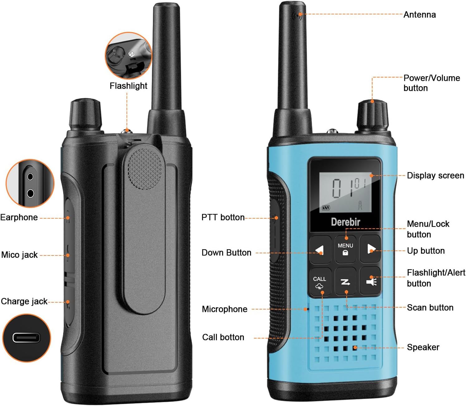 【VOX Hands-free & Clear Sound】Derebir rechargeable walkie talkies for adults have easy voice and sound activation transmission (VOX) with 3 sensitivity levels for hands-free operation. Our long range walkie talkies come with upgraded large speakers with 150% more volume, noise reduction technology and stronger penetration, you can hear clear sound without distortion even in noisy environments