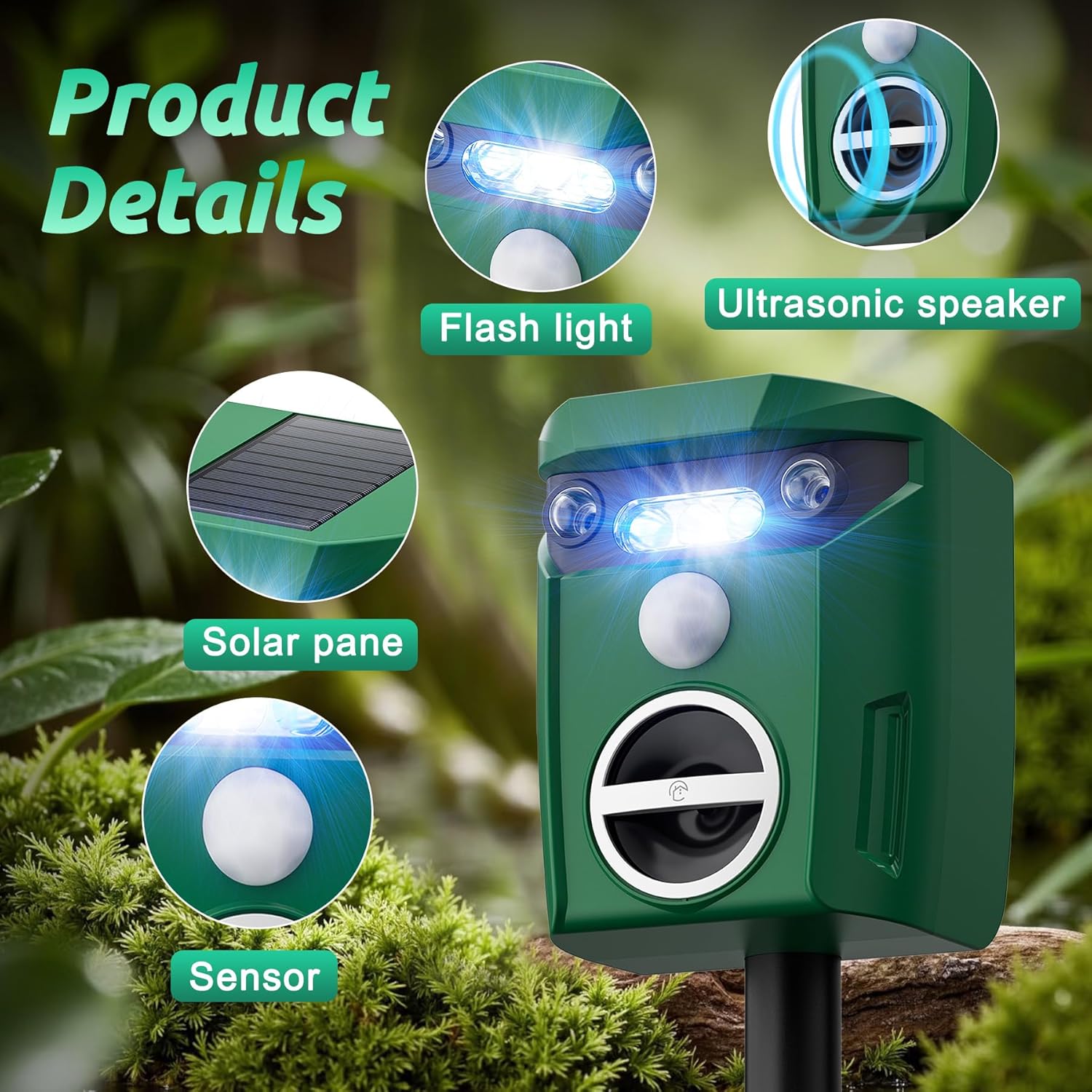 [Effective Protection]: Utilizing a combination of adjustable ultrasonic waves, intense flashing strobe lights, and optional alarm sounds, this deer repellent devices effectively disrupts the senses of deer, cats, dogs, raccoons, rabbits, skunks, and more. The varying frequencies prevent adaptation, ensuring long-term effectiveness.