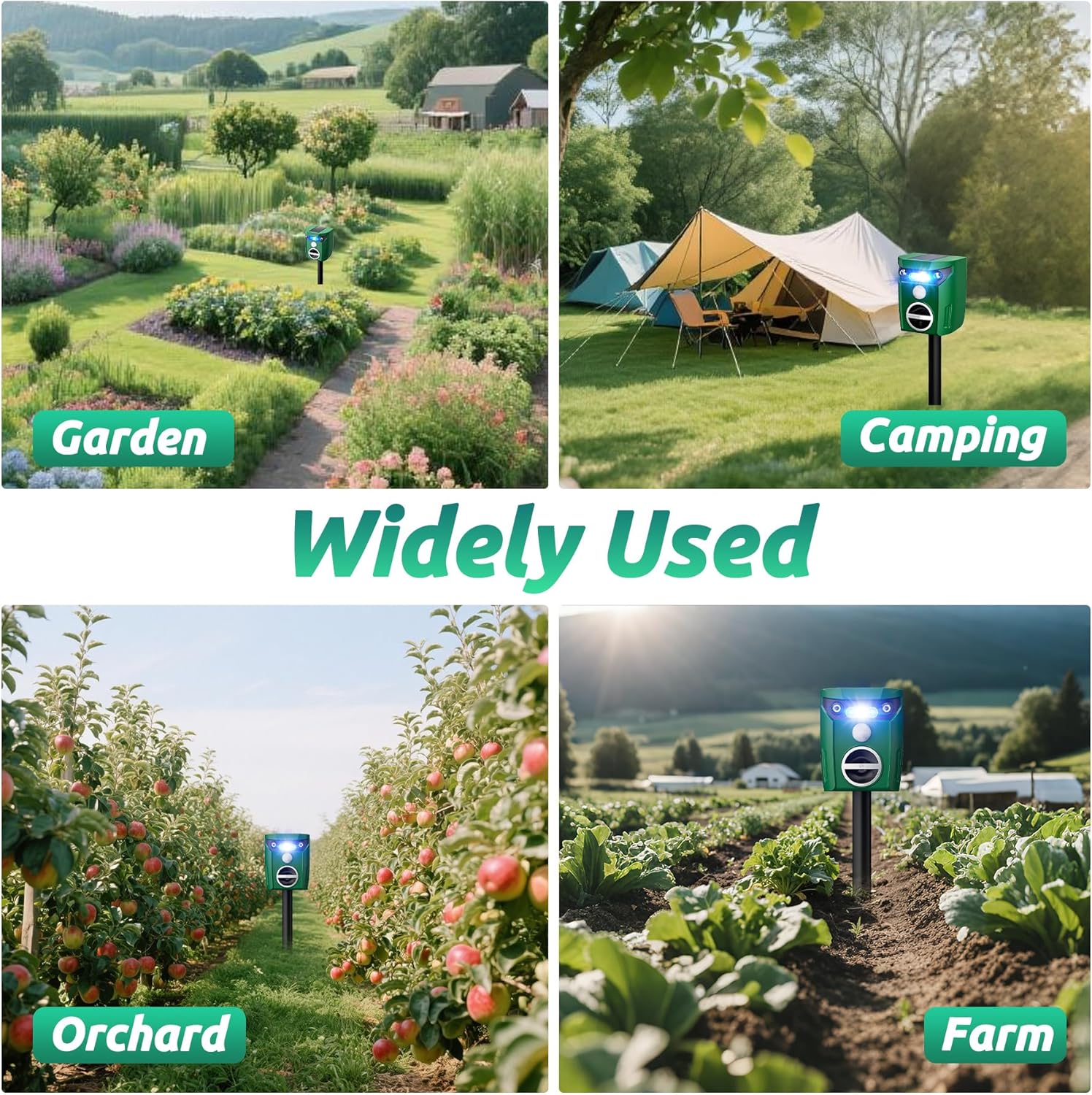 [Solar-Powered and Weatherproof]: Equipped with a high-efficiency solar panel for continuous charging, this animal repellent operates wirelessly and maintenance-free. Its IP64 waterproof rating guarantees reliable performance in various weather conditions, making it ideal for year-round use in gardens, yards, farms, and orchards.