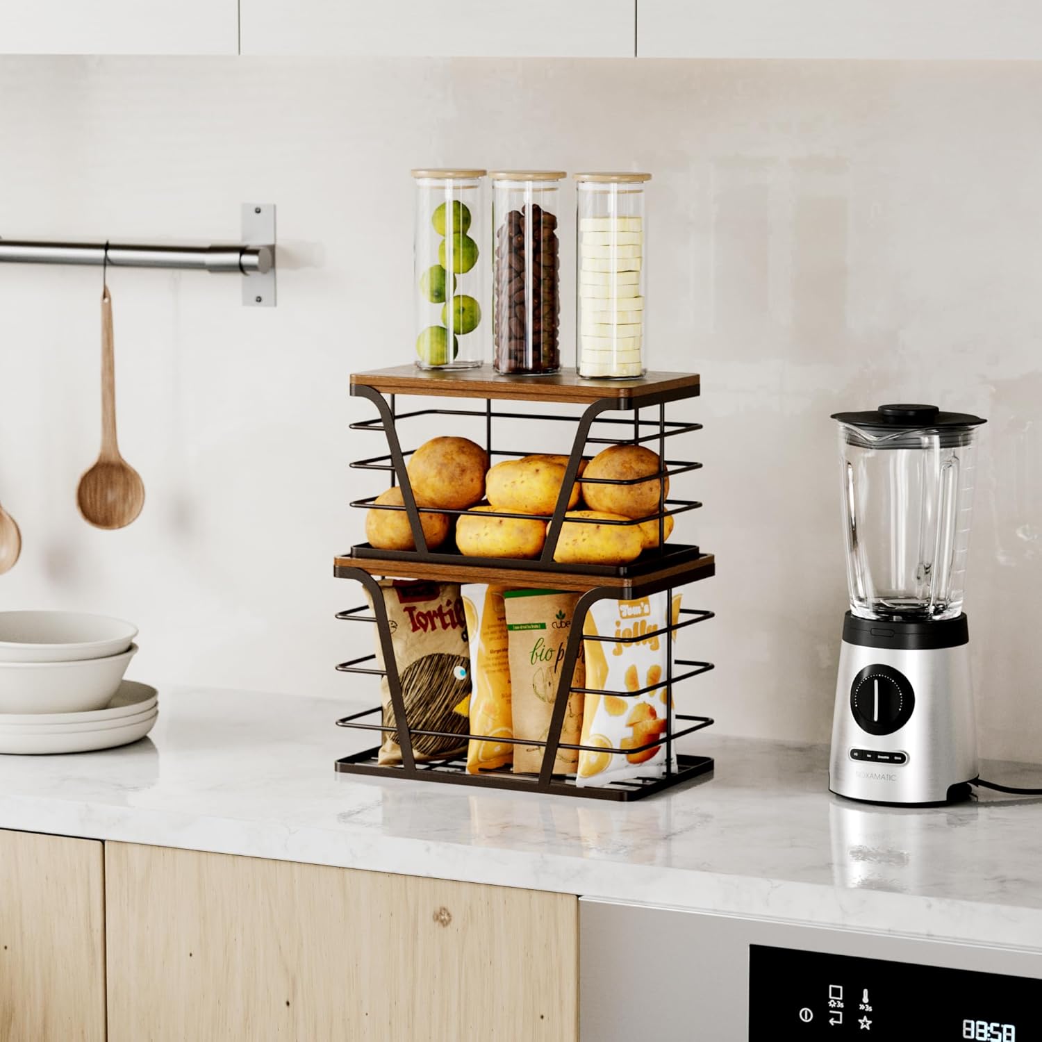 Modular Stacking: Adjust tiers vertically (total height: 16″) for small kitchen storage or wall basket storage setups.