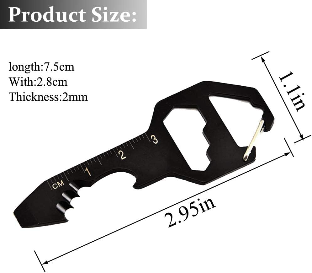 Q:What are the different tools included in this keychain tool?A:This keychain tool includes a bottle opener, flathead screwdriver, metric ruler, cord cutter, and wrenches of various sizesQ:How many small key size tools will I receive?A:2PCS in the package, one Silver and one BlackQ:Is this gadget suitable for all keychains?A:Yes, this gadget fits most keychains, and easy to useQ:Can this keychain multitool be used for emergency situations?A:This keychain tool could potentially assist in emergency situations, but it is not specifically designed for that purpose