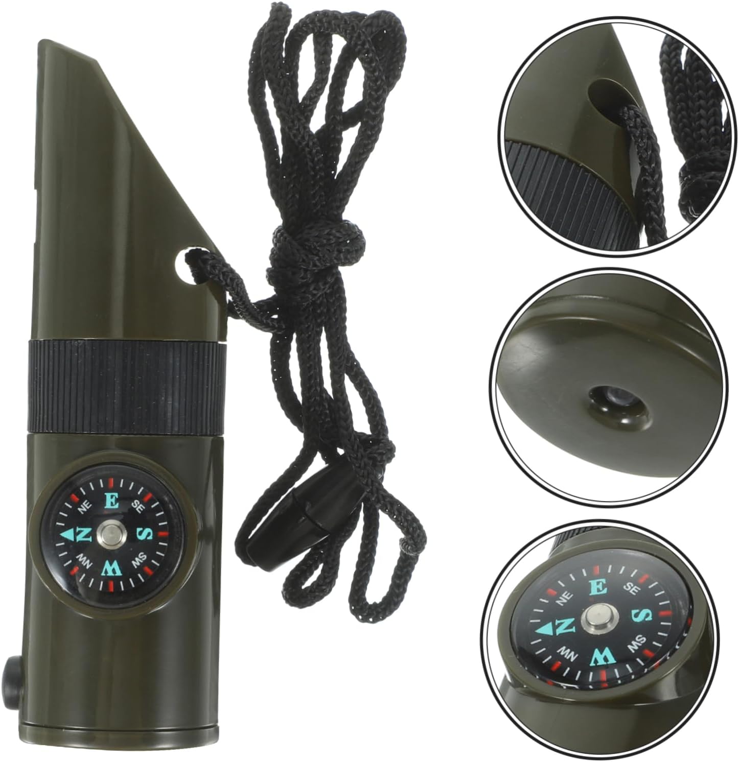 – Our Multi-functional survival whistle is comes with Lanyard. On one side there is a compass, and the other is thermometer, also has LED light and magnifier, 7 in 1 multi-functional whistle with thermometer.